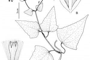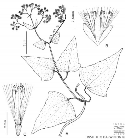 Enredaderas perennes, con tallos multiestrados pilosos. Hojas opuestas, cortamente pecioladas, con pecíolos de 0,5-2 cm de largo y láminas ovado-deltoides, de 2,5-5 × 2-3,5 cm, con margen crenado a liso, base subcordada a truncada y ápice agudo, pelos simples y glandulares punctiformes en ambas caras; estípulas ausentes. Capítulos numerosos, pedunculados, dispuestos en cimas corimbiformes terminales y axilares. Involucro de 3-4 mm de alto; filarios oblongo-obovados, ca. 1 mm de ancho, con ápice redondeado, pubescentes; bractéola linear a linear-lanceolada, de 2-3 × 0,4 mm, pubescente, inserta en la base del pedúnculo. Flores con corola blanca, tubulosa, de 3- 3,5 mm de largo, tubo de 1-1,3 mm y limbo infundibuliforme de 2- 2,2 mm de largo, dividido en lóbulos triangular-lanceolados de 0,8-1,2 mm de largo. Aquenios glandulosos de 2,5 mm de largo. Papus blanco compuesto por 40-45 aristas escábridas de 3 mm de largo.
