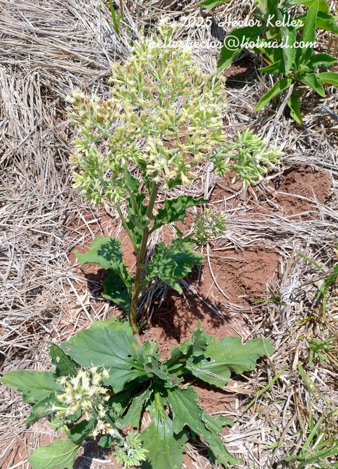 Sufrútices erectos, rizomatosos de 0,50-1 m de alto, con tallos multiestriados, pubescentes. Hojas opuestas, atenuadas en un pseudopecíolo de 1-3 cm de largo; láminas deltoides, de 5-12 × 4- 10 cm, 3-nervadas, de ápice acuminado, irregularmente dentadas, con dientes subtriangulares, mucronados, envés con pelos simples, flexibles, densamente dispuestos sobre las nervaduras y haz con pelos simples, hirsutos; domacios «en bolsillo», basales, centrales y laterales y «en canal»; estípulas foliáceas laciniadas de 5-6 x 0,2-0,3 mm. Capítulos muy numerosos, pedunculados, dispuestos en cimas compuestas corimboides, terminales y laterales. Involucro de 7-8(-10) mm de alto; filarios oblongo-lanceolados, de 1,6-2 mm de ancho, pubescentes en el dorso; bractéola linear o linear-lanceolada, aguda, de 4 × 0,3-0,5 mm, pubescente. Flores con corola blanca o blanco-verdosa, tubulosa, de 6-7 mm de largo, tubo de 2,5 mm y limbo infundibuliforme de 4 mm de largo, dividido en lóbulos de 1,8-2 mm de largo. Aquenios de 4-6 mm de largo, ciliados en los bordes y con pelos simples y pelos glandulares punctiformes, dispersos. Papus amarillento o rosado, provisto de 90-95(-120) aristas escábridas, de 6-8 mm de largo.