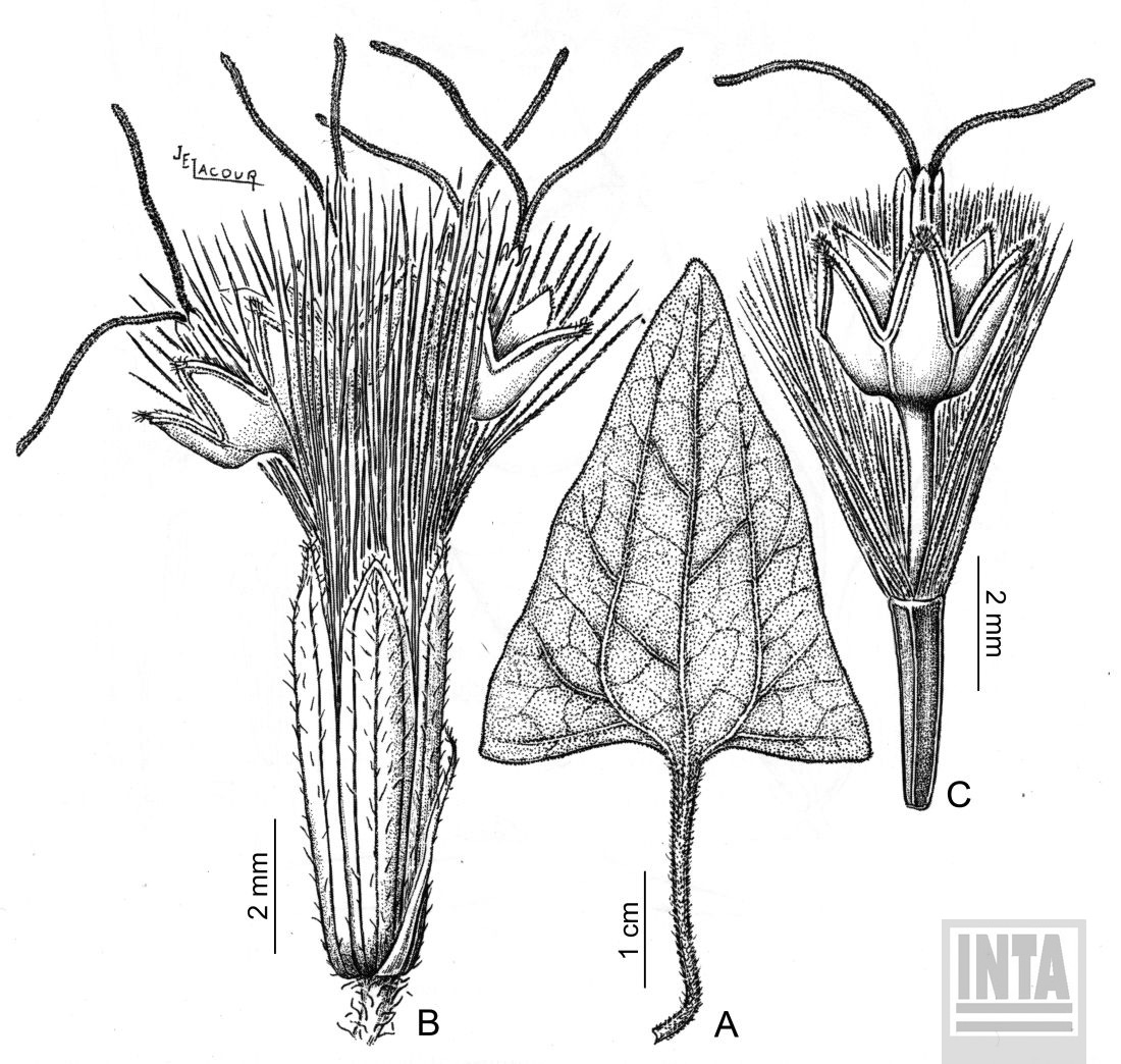 Enredaderas perennes, con tallos multiestriados, ligeramente pubescentes a glabros. Hojas opuestas, pecioladas, con pecíolos de 1-3 cm de largo, láminas deltoides con base hastada, de 2,5-7 × 1,5-5 cm, las de mayor tamaño con un lóbulo a cada lado, margen liso o ligeramente ondulado y ápice agudo, pelos escasos, cortos y rígidos en la haz y más largos y flexibles en el envés; nervaduras muy conspicuas, notablemente ensanchadas en la zona de intersección con venas de menor envergadura; domacios «en bolsillo», basales, centrales y laterales y «en canal»; estípulas ausentes. Capítulos numerosos, pedunculados, dispuestos en cimas corimbiformes densas, axilares y terminales. Involucro de 5,7-7 mm de alto; filarios oblongo-lanceolados u oblanceolados, de ápice agudo, de 1,5-2 mm de ancho, de ápice agudo, glabros o ligeramente pubescentes; bractéola lanceolada u oval-lanceolada, de 2,8-6,2 × 1-2 mm, pubescente. Flores con corola blanca, tubulosa, de 4,5-5,5 mm de largo, tubo de 2,5-3 mm y limbo infundibuliforme a campanulado de 2-2,8 mm de largo, dividido en lóbulos lanceolados u oblanceolados, ondulados en sus márgenes, de 1,5-1,8 mm de largo. Aquenios de 4 mm de largo, pubescentes, con bordes ciliados. Papus blancoamarillento compuesto por 40-50 aristas escábridas de 5-6,5 mm de largo.