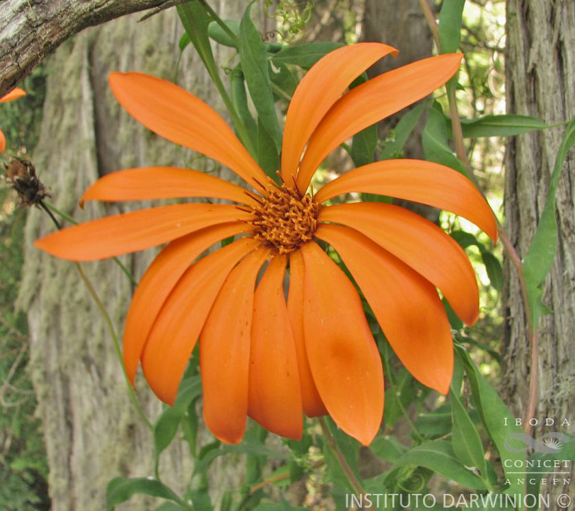 Sufrútices volubles; tallos alados, muy ramificados, glabros. Hojas alternas, sésiles, lanceoladas, de 5,5-10 × 0,8-2 cm, decurrentes en la base a lo largo del tallo, agudas y terminadas en el ápice con un zarcillo 2-fido, enteras o dentadas en los márgenes, glabras en ambas caras o tomentosas en la inferior. Capítulos heterógamos, radiados, solitarios en el extremo de las ramitas, largamente pedunculados; pedúnculos de 3-10 cm de largo. Involucro acampanado, de 25-38 × 12-20 mm; filarios dispuestos en 4-5 series, los externos anchamente ovados, de 5- 10 × 10 mm, terminados en un corto apéndice linear, los intermedios ovados, los internos oblongo-ovados, de 35 × 10 mm, agudos en el ápice, todos ellos glabros en el dorso. Flores dimorfas, las del margen 10-15, pistiladas, con corolas de color naranja fuerte, subliguladas, tubo ca. 20 mm de largo, lígulas anchamente elípticas, de 25-40 × 6-10 mm, 3-dentadas en el ápice, labio interior reducido a 2 segmentos lineares y cortos; flores del centro numerosas, perfectas, con corolas bilabiadas, tubo ca. 22 mm de largo, labios de 10-12 mm de largo, el exterior 3-dentado y el interno 2-fido. Aquenios cilindroides, atenuados en el ápice, ca. 10 mm de largo, glabros. Papus blanquecino, ca. 25 mm de largo.