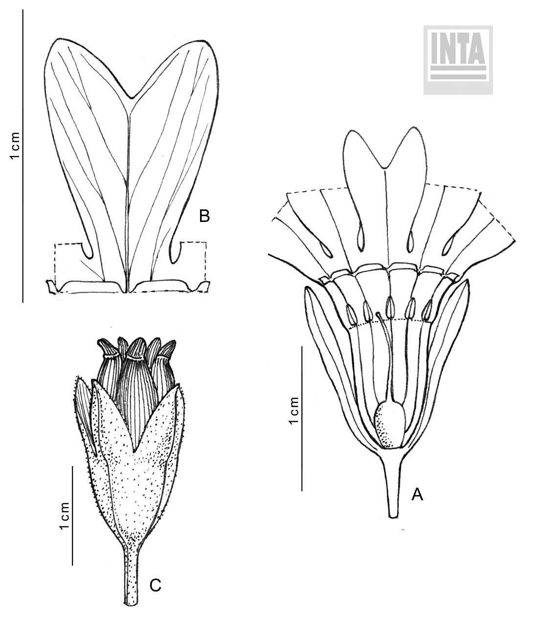 A. Flor con la corola desplegada. B. Detalle del pétalo. C. Fruto con el cáliz persistente.