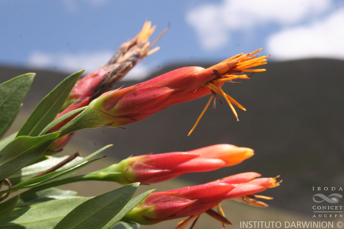 Arbustos erectos, de 1-2 m de alto; tallos sin alas, erectos, densamente hojosos, glabros o tomentosos cuando jóvenes. Hojas alternas, cortamente pecioladas; pecíolos de 1-5 mm de largo; láminas lanceoladas o elíptico-lanceoladas, de 5-12 × 1,2- 2,5 cm, atenuadas en la base, agudo-acuminadas en el ápice, enteras o profundamente pinnatisectas, con 7-9 segmentos a cada lado, lanceolados, de 15-20 × 5-7 mm, acuminados en el ápice, papiráceos, glabros en ambas caras o albo-tomentosos en la inferior. Capítulos homógamos, discoides, solitarios en el extremo de las ramitas, largamente pedunculados; pedúnculos de 1-9 cm de largo. Involucro cilíndrico, de 38-50 × 11-20 mm; filarios dispuestos en 5-7 series, los externos ovados, de 5-10 × 10 mm, terminados en un apéndice linear de 5-10 mm de largo, los intermedios elípticos y con un corto apéndice linear, los internos lanceolados, de 45 × 8-9 mm, obtusos o subagudos en el ápice, todos ellos rojos, amarillentos y a veces tomentosos en los bordes y laxamente glandulosos o glabros en el dorso. Flores isomorfas, 15-20, perfectas, con corolas amarillo-anaranjadas, bilabiadas, tubo ca. 30 mm de largo, labios subiguales, de 10-12 mm de largo, el exterior oblongo, 3-dentado y el interno 2-fido con 2 segmentos lineares. Aquenios cilindroides, atenuados en el ápice, de 15 mm de largo, glabros. Papus leonado, ca. 15 mm de largo.