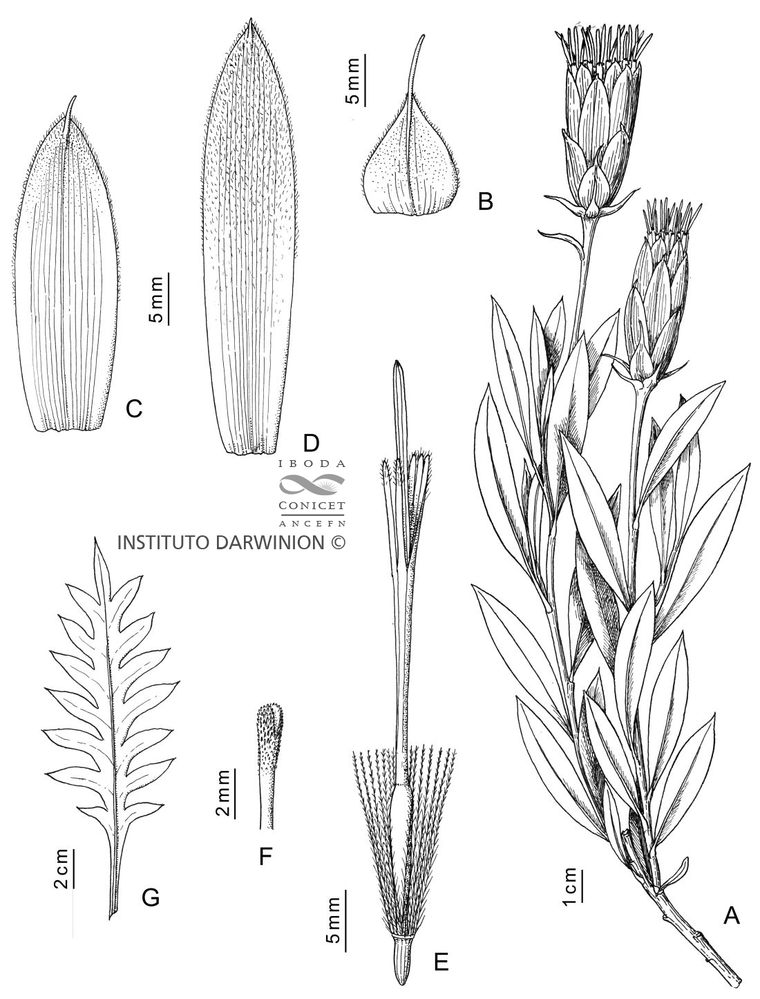 A. Rama florífera. B-D. Filarios. E. Flor perfecta. F. parte superior del estilo. Mutisia kurtzii var. pinnata. G. Hoja profundamente pinnatisecta.