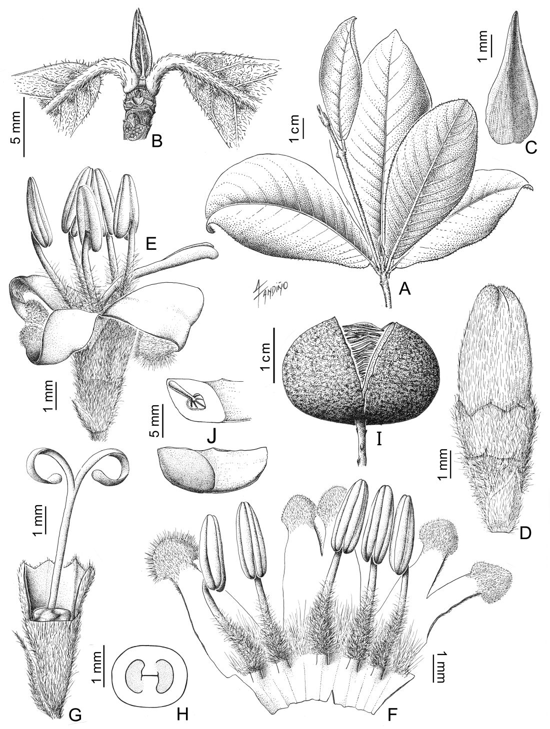 A. Rama con hojas. B. Estípula. C. Interior de estípula. D. Botón floral. E. Flor en antesis. F. Corola desplegada y androceo. G. Hipanto, lóbulos y tubo calicino, estilo y estigma. H. Corte esquemático del ovario. I. Fruto dehiscente. J. Semilla alada en corte longitudinal (arriba) y en vista lateral (abajo).