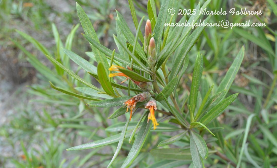 Arbustos erectos, de 1-2 m de alto; tallos sin alas, erectos, los jóvenes densamente hojosos, glabros o ligeramente tomentosos en la parte superior. Hojas alternas, sésiles, estrechamente lanceoladas, de 35-70 × 4-8(-12) mm, atenuadas en la base, agudas en el ápice, enteras en el margen, glabras en ambas caras. Capítulos homógamos, discoides, solitarios en el extremo de las ramitas, cortamente pedunculados y rodeados por las hojas superiores. Involucro cilíndrico, de 25-35(-40) × 5- 10 mm; filarios dispuestos en 5 series, los externos anchamente ovados, de 5-10 × 5-8 mm, terminados en un apéndice linear, de 5- 10 mm de largo, los intermedios lanceolados, con apéndice linear corto, los internos oblongo-lanceolados, de 30-35 × 4 mm, cortamente mucronados en el ápice, todos ellos rojizos y glabros o apenas tomentosos en el dorso. Flores isomorfas, 5-8, perfectas, con corolas anaranjadas, bilabiadas, tubo ca. 12 mm de largo, labios ca. 25 mm de largo, el exterior 4-dentado y piloso en el ápice, el interior simple, linear. Aquenios cilindroides, atenuados en el ápice, de 8-9 mm de largo, glabros. Papus grisáceo, de 17-18 mm de largo.