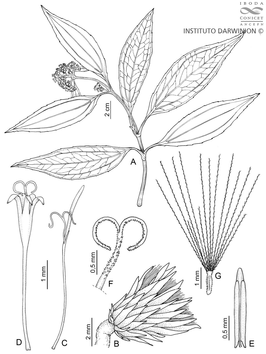 A. Rama florífera. B. Capítulo. C. Flor del margen (aquenio y papus no dibujados). D. Flor del centro (aquenio y papus no dibujados). E. Estambre. F. Parte superior del estilo de la flor del centro. G. Aquenio y papus.