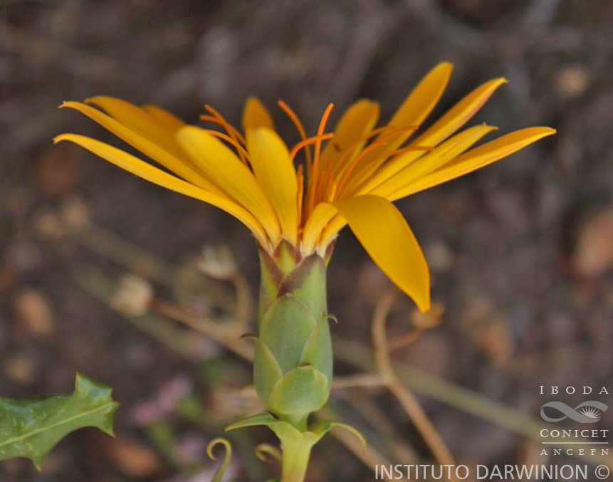 Sufrútices volubles, de 0,5-1,5 m de largo, glabros; tallos flexuosos, parcialmente alados. Hojas alternas, sésiles, oblongolanceoladas, de 2,5-8 × 1-2 mm, ensanchadas y decurrentes en la base en 2 alas anchas que se contraen abruptamente en alas muy estrechas sobre el tallo, runcinadas y revolutas en el margen, con 3-5 lóbulos triangulares a cada lado, glabras en la cara superior y densamente albo-tomentosas en la inferior. Capítulos heterógamos, radiados, solitarios, largamente pedunculados; pedúnculos de 1-6 cm de largo. Involucro acampanado, de 2-2,5 × 1 cm; filarios dispuestos en 5 series, los externos anchamente ovados, de 3-7 × 6 mm, terminados en un apéndice linear y recurvado, los intermedios ovados, obtusos y terminados en un apéndice linear corto, los internos oblongo-lanceolados, de 2-2,5 cm × 8 mm, subagudos-mucronados en el ápice, todos ellos glabros. Flores dimorfas, las del margen 10-12, pistiladas, con corolas amarillas, subliguladas, tubo ca. 2 cm de largo, lígulas anchamente elípticas, de 2,5-3 cm × 6 mm, 3-dentadas en el ápice, labio interior reducido a 2 segmentos lineares y cortos; flores del centro perfectas, numerosas, con corolas amarillas, bilabiadas, tubo ca. 1,6 cm de largo, labios ca. 8 mm de largo, el exterior 3- dentado y el interno 2-fido. Aquenios cilindroides, atenuados en el ápice, ca. 1,5 cm de largo, glabros. Papus blanquecino, ca. 1,5 cm de largo.