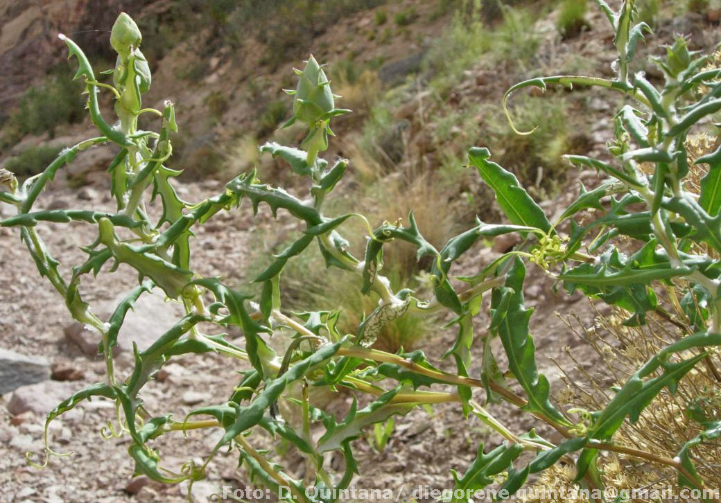 Sufrútices volubles, de 0,5-1,5 m de largo, glabros; tallos flexuosos, parcialmente alados. Hojas alternas, sésiles, oblongolanceoladas, de 2,5-8 × 1-2 mm, ensanchadas y decurrentes en la base en 2 alas anchas que se contraen abruptamente en alas muy estrechas sobre el tallo, runcinadas y revolutas en el margen, con 3-5 lóbulos triangulares a cada lado, glabras en la cara superior y densamente albo-tomentosas en la inferior. Capítulos heterógamos, radiados, solitarios, largamente pedunculados; pedúnculos de 1-6 cm de largo. Involucro acampanado, de 2-2,5 × 1 cm; filarios dispuestos en 5 series, los externos anchamente ovados, de 3-7 × 6 mm, terminados en un apéndice linear y recurvado, los intermedios ovados, obtusos y terminados en un apéndice linear corto, los internos oblongo-lanceolados, de 2-2,5 cm × 8 mm, subagudos-mucronados en el ápice, todos ellos glabros. Flores dimorfas, las del margen 10-12, pistiladas, con corolas amarillas, subliguladas, tubo ca. 2 cm de largo, lígulas anchamente elípticas, de 2,5-3 cm × 6 mm, 3-dentadas en el ápice, labio interior reducido a 2 segmentos lineares y cortos; flores del centro perfectas, numerosas, con corolas amarillas, bilabiadas, tubo ca. 1,6 cm de largo, labios ca. 8 mm de largo, el exterior 3- dentado y el interno 2-fido. Aquenios cilindroides, atenuados en el ápice, ca. 1,5 cm de largo, glabros. Papus blanquecino, ca. 1,5 cm de largo.