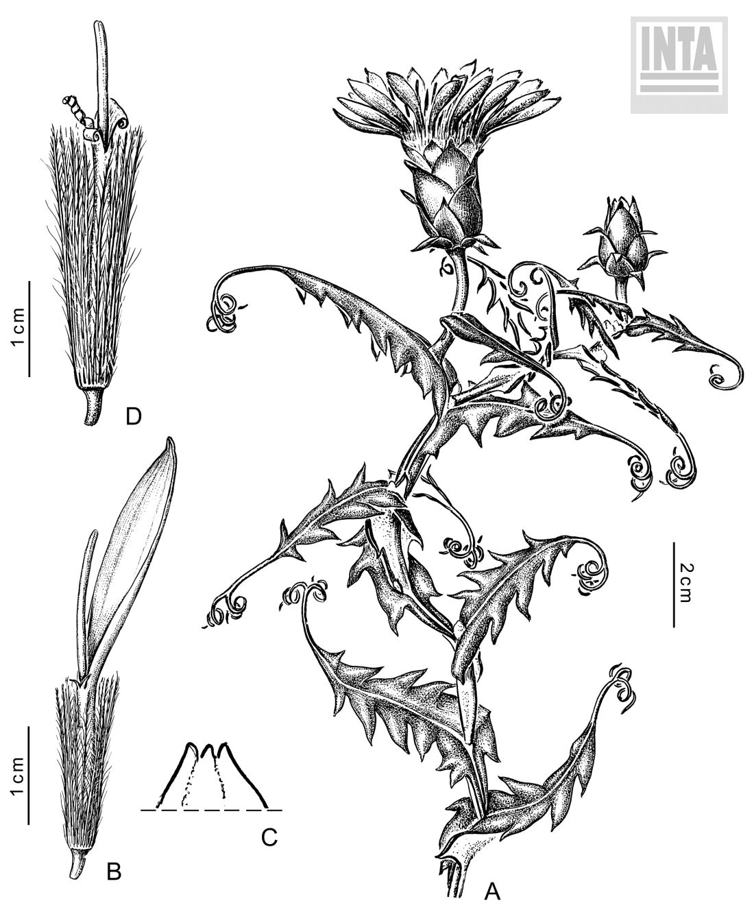 Sufrútices volubles, de 0,5-1,5 m de largo, glabros; tallos flexuosos, parcialmente alados. Hojas alternas, sésiles, oblongolanceoladas, de 2,5-8 × 1-2 mm, ensanchadas y decurrentes en la base en 2 alas anchas que se contraen abruptamente en alas muy estrechas sobre el tallo, runcinadas y revolutas en el margen, con 3-5 lóbulos triangulares a cada lado, glabras en la cara superior y densamente albo-tomentosas en la inferior. Capítulos heterógamos, radiados, solitarios, largamente pedunculados; pedúnculos de 1-6 cm de largo. Involucro acampanado, de 2-2,5 × 1 cm; filarios dispuestos en 5 series, los externos anchamente ovados, de 3-7 × 6 mm, terminados en un apéndice linear y recurvado, los intermedios ovados, obtusos y terminados en un apéndice linear corto, los internos oblongo-lanceolados, de 2-2,5 cm × 8 mm, subagudos-mucronados en el ápice, todos ellos glabros. Flores dimorfas, las del margen 10-12, pistiladas, con corolas amarillas, subliguladas, tubo ca. 2 cm de largo, lígulas anchamente elípticas, de 2,5-3 cm × 6 mm, 3-dentadas en el ápice, labio interior reducido a 2 segmentos lineares y cortos; flores del centro perfectas, numerosas, con corolas amarillas, bilabiadas, tubo ca. 1,6 cm de largo, labios ca. 8 mm de largo, el exterior 3- dentado y el interno 2-fido. Aquenios cilindroides, atenuados en el ápice, ca. 1,5 cm de largo, glabros. Papus blanquecino, ca. 1,5 cm de largo.