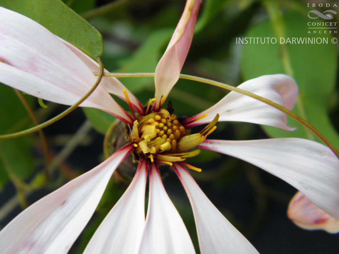 Sufrútices volubles, ramosos; tallos jóvenes con alas espinosodentadas, los viejos sin alas, glabros o laxamente lanuginosos en la parte superior. Hojas alternas, sésiles, elípticas u ovado-elípticas, de 4-6 × 2-3,5 cm, acorazonadas y semiabrazadoras en la base, emarginadas en el ápice y terminadas en un largo zarcillo simple, con 1 ó 2 dientes en la parte superior o a veces dentado-espinosas en todo el margen, glabras en ambas caras o lanuginosas a densamente tomentosas en la inferior. Capítulos heterógamos, radiados, solitarios en el extremo de las ramitas, largamente pedunculados; pedúnculos de 4-8 cm de largo. Involucro acampanado, ca. 20 × 10 mm; filarios dispuestos en 5 series, los externos semicirculares, de 1-3 × 7-8 mm, terminados en un apéndice linear-lanceolado, corto y recurvado, glabros, los internos oblongos, de 15-16 × 7,5 mm, redondeados y ligeramente pilosos en el ápice. Flores dimorfas, las del margen 8-10, pistiladas, con corolas de color rosa pálido, subliguladas, tubo ca. 15 mm de largo, lígulas anchamente elípticas, ca. 30 × 8 mm, 3-dentadas en el ápice, labio interior reducido a un apéndice linear muy corto; flores del centro numerosas, perfectas, con corolas amarillas, bilabiadas, tubo ca. 20 mm de largo, labios 9-10 mm de largo, el exterior 3-dentado y el interno 2-fido. Aquenios cilindroides, atenuados en el ápice, ca. 15 mm de largo, glabros. Papus blanquecino, ca. 20 mm de largo.