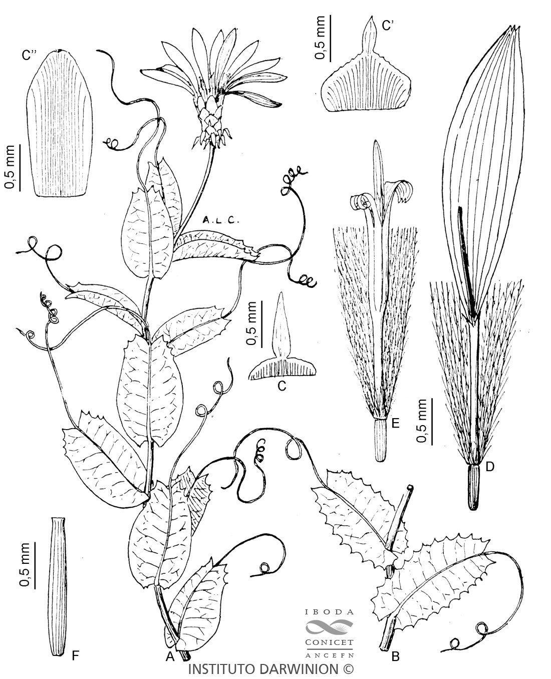 Sufrútices volubles, ramosos; tallos jóvenes con alas espinosodentadas, los viejos sin alas, glabros o laxamente lanuginosos en la parte superior. Hojas alternas, sésiles, elípticas u ovado-elípticas, de 4-6 × 2-3,5 cm, acorazonadas y semiabrazadoras en la base, emarginadas en el ápice y terminadas en un largo zarcillo simple, con 1 ó 2 dientes en la parte superior o a veces dentado-espinosas en todo el margen, glabras en ambas caras o lanuginosas a densamente tomentosas en la inferior. Capítulos heterógamos, radiados, solitarios en el extremo de las ramitas, largamente pedunculados; pedúnculos de 4-8 cm de largo. Involucro acampanado, ca. 20 × 10 mm; filarios dispuestos en 5 series, los externos semicirculares, de 1-3 × 7-8 mm, terminados en un apéndice linear-lanceolado, corto y recurvado, glabros, los internos oblongos, de 15-16 × 7,5 mm, redondeados y ligeramente pilosos en el ápice. Flores dimorfas, las del margen 8-10, pistiladas, con corolas de color rosa pálido, subliguladas, tubo ca. 15 mm de largo, lígulas anchamente elípticas, ca. 30 × 8 mm, 3-dentadas en el ápice, labio interior reducido a un apéndice linear muy corto; flores del centro numerosas, perfectas, con corolas amarillas, bilabiadas, tubo ca. 20 mm de largo, labios 9-10 mm de largo, el exterior 3-dentado y el interno 2-fido. Aquenios cilindroides, atenuados en el ápice, ca. 15 mm de largo, glabros. Papus blanquecino, ca. 20 mm de largo.