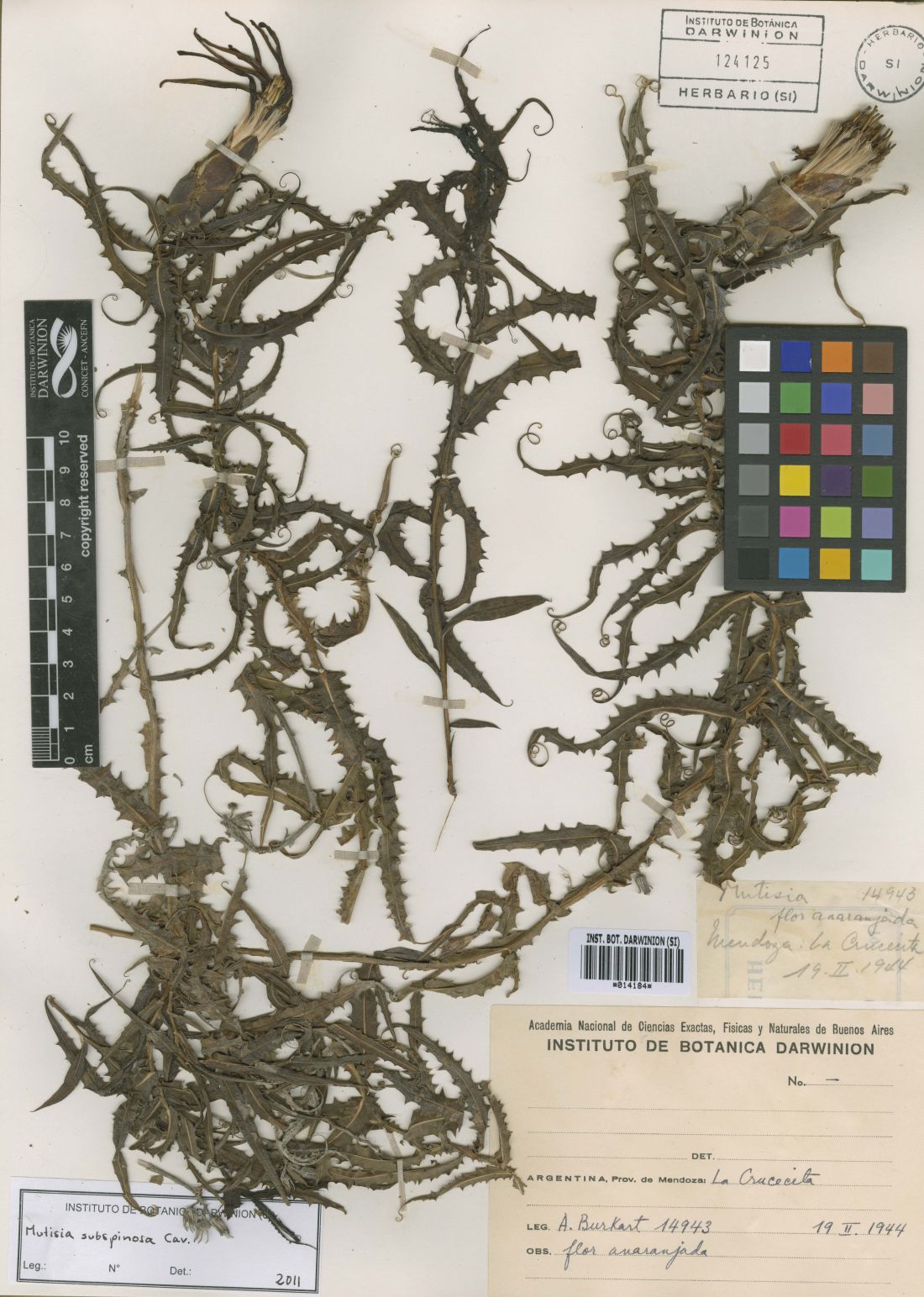 Sufrútices volubles, de 1-1,5 m de largo, ramosos; tallos ondulados, alados, con alas dentado-espinosas de 2-5 mm de ancho, glabros. Hojas alternas, sésiles, lanceoladas, de 8-10 × 0,6-1,3 cm, semihastadas en la base, notablemente atenuadas en el ápice y terminadas en un largo zarcillo simple, dentadoespinosas en el margen, con 10-14 dientes mucronados a cada lado, glabras en ambas caras. Capítulos heterógamos, radiados, solitarios en el extremo de las ramitas, cortamente pedunculados; pedúnculos de 5-15 mm de largo. Involucro acampanado, de 20- 25 × 10-12 mm; filarios dispuestos en 6 series, los externos semicirculares, de 2-5 × 10 mm, terminados en un apéndice linearlanceolado y recurvado, de 5-8 mm de largo, los intermedios anchamente ovados, obtusos y con un corto apéndice linear en el ápice, los internos oblongos, ca. 20 × 9 mm, obtusos y ligeramente pilosos en el ápice. Flores dimorfas, las del margen 8-10, pistiladas, con corolas anaranjadas, subliguladas, tubo ca. 23 mm de largo, lígulas anchamente elípticas, ca. 23 × 6 mm, 3- dentadas en el ápice, labio interior reducido a 2 cortos segmentos lineares; flores del centro perfectas, numerosas, con corolas amarillas, bilabiadas, tubo ca. 17 mm de largo, labios ca. 8 mm de largo, el exterior 3-dentado y el interno 2-fido. Aquenios cilindroides, atenuados en el ápice, ca. 15 mm de largo, glabros. Papus blanco-rosado, ca. 22 mm de largo.
