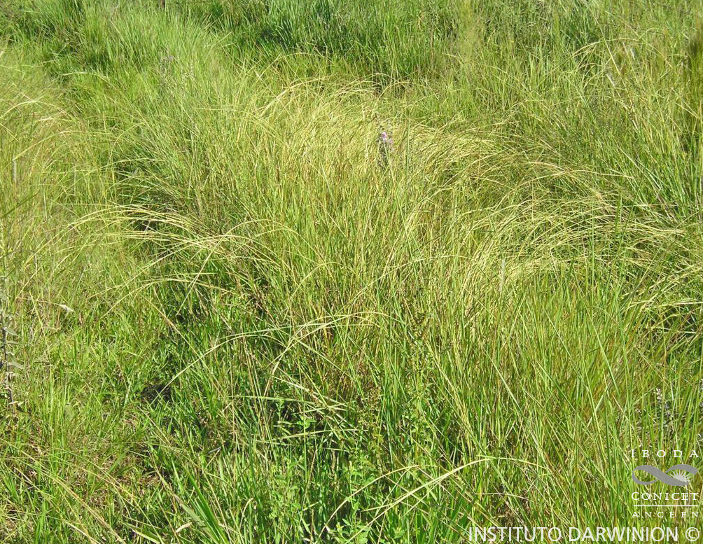Plantas perennes de 70-100 cm de alto; lígulas de 0,5-0,75(-1) mm de largo, ligeramente oblicua; láminas de 5-16(-20) cm x 5-8 mm, base ligeramente más estrecha a nivel de la lígula, ápice generalmente obtuso a subagudo. Inflorescencia paucirramosa, con 4-15 racimos; espateola de 4-8 cm de largo, ápice agudo, aquillada en la porción superior; pedúnculo de 3-10 cm de largo, con la la porción apical exerta a la madurez; racimos de 6-8 cm de largo, con 6-15(-20) pares de espiguillas; raquis recto; artejos de 4-5 mm de largo, rectos, escabriúsculos, pilosos en uno o ambos márgenes, de ápice cóncavo 2-dentado; callo truncado con pelos rígidos, hialinos de 0,75-1 mm de largo. Espiguillas adpresas al raquis: Espiguillas sésiles con la gluma inferior de 5-6 x 1-1,2 mm, cartilaginosa, dorso ligeramente cóncavo, notoriamente tuberculado-escabroso, la zona apical con tonalidad oscura, los márgenes inflexos, el ápice obtuso ligeramente bífido; gluma superior ligeramente más larga y de consistencia similar a la de la inferior, aquillada, de dorso tuberculado-escabroso principalmente sobre la quilla en la ½ inferior, ápice obtuso; lemma inferior estéril, de 5-5,5 mm de largo, ápice obtuso; lemma superior fértil de 4-4,5 mm, lobada hasta la ½ o más, lóbulos de 2,5-3 mm de largo, arista de 15-20(-25) mm de largo entre los lóbulos, columna oscura, negra de 7-10 mm de largo, segmento distal de 5-15 mm de largo; pálea ausente o muy reducida, de 0,7 mm de largo, hialina de ápice subagudo; lodículas truncadas, de 0,5-0,75 mm de largo; anteras rojizas de 1-2 mm de largo; ovario de 0,75-1,25 mm de largo; cariopsis de 3-3,5 x 1-1,2 mm. Espiguillas pediceladas neutras, reducidas; pedicelos de 4-5 mm de largo, comprimidos dorsiventralmente, escabriúsculos en la porción distal, ciliados en uno o ambos márgenes; gluma inferior únicamente de 0,5-1,5 mm de largo, el nervio central prolongado en una arista apical de 4-6 mm de largo, arista y gluma escabriúsculas.