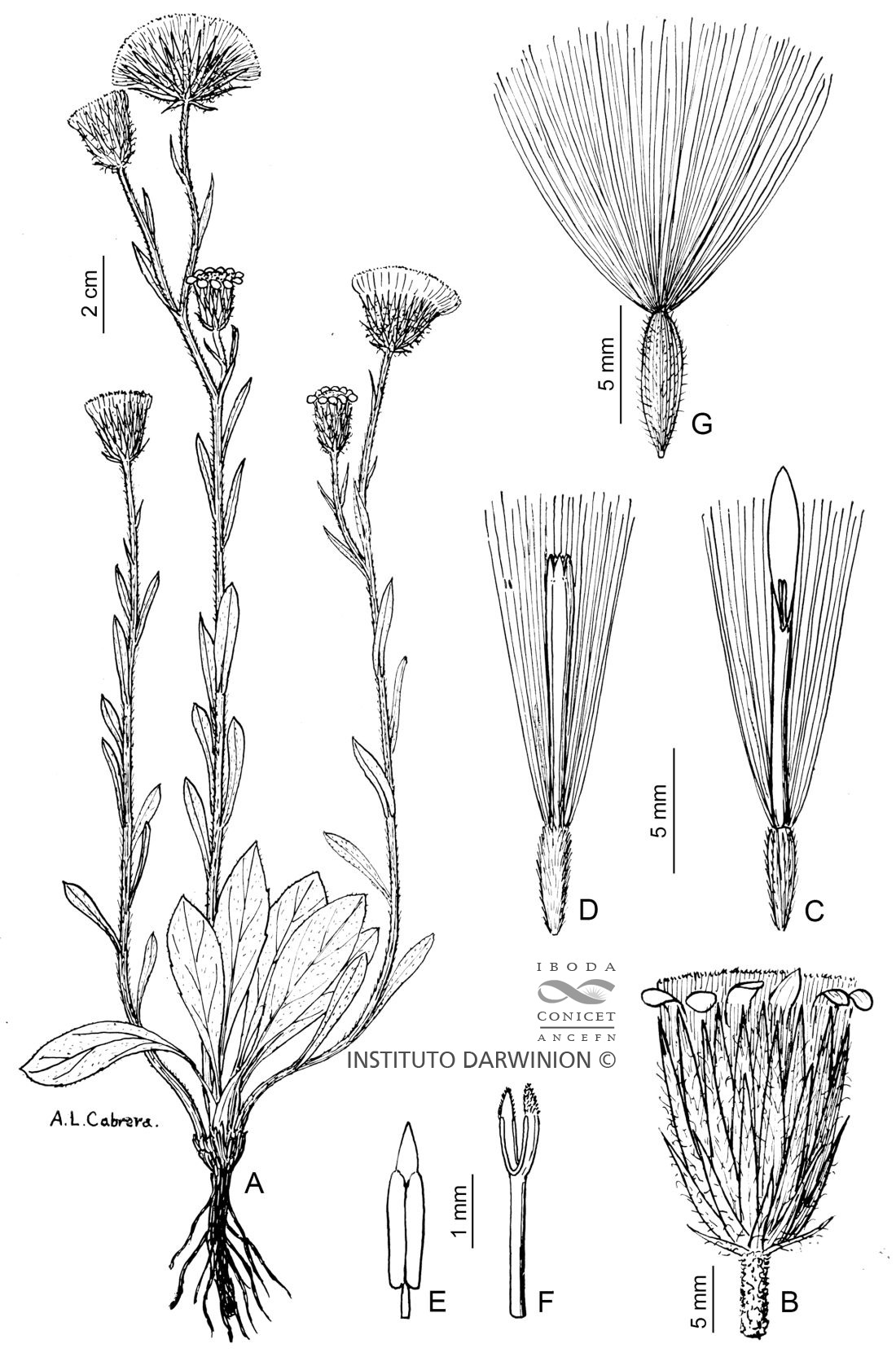 Hierbas perennes, rizomatosas, de 20-35 cm de largo, con varios tallos simples, hojosos, curvados hacia arriba, glabras a lanosas en partes jóvenes. Hojas obovadas, de 15-20 × ca. 3 mm, base largamente atenuada, semiabrazadora, ápice subagudo u obtuso, margen entero, subglabras a laxamente pilosas; hojas superiores esparcidas, oblongas, subatenuadas, reducidas, lanosas. Capítulos solitarios (2-4), cortamente radiados, pedunculados, de 15-17 × 15-18 mm. Involucro acampanado; filarios graduados dispuestos en 5 series, linear-ovados, de 5-14 × 1-1,5 mm, agudos, lanosos, especialmente en el ápice. Flores del margen en 1 serie, con corola blanca, de 11-12 mm de largo, limbo de 3-5 × ca. 1 mm; flores del centro con corola ca. 9 mm de largo. Aquenios elipsoides, de 5-6 × ca. 1,2 mm, seríceos. Papus pajizo, ca. 11 mm de largo.