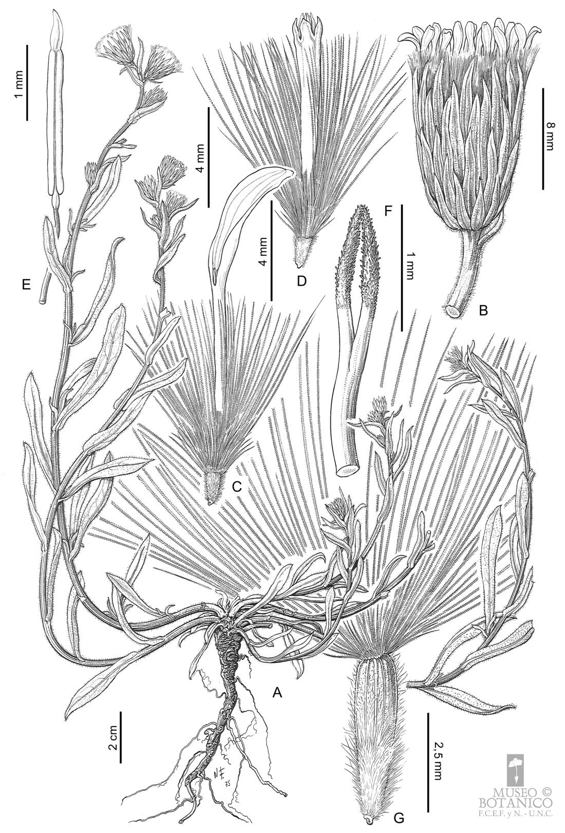 A. Planta. B. Capítulo. C. Flor del margen. D. Flor del centro. E. Estambre. F. Estilo (sección). G. Aquenio con papus.