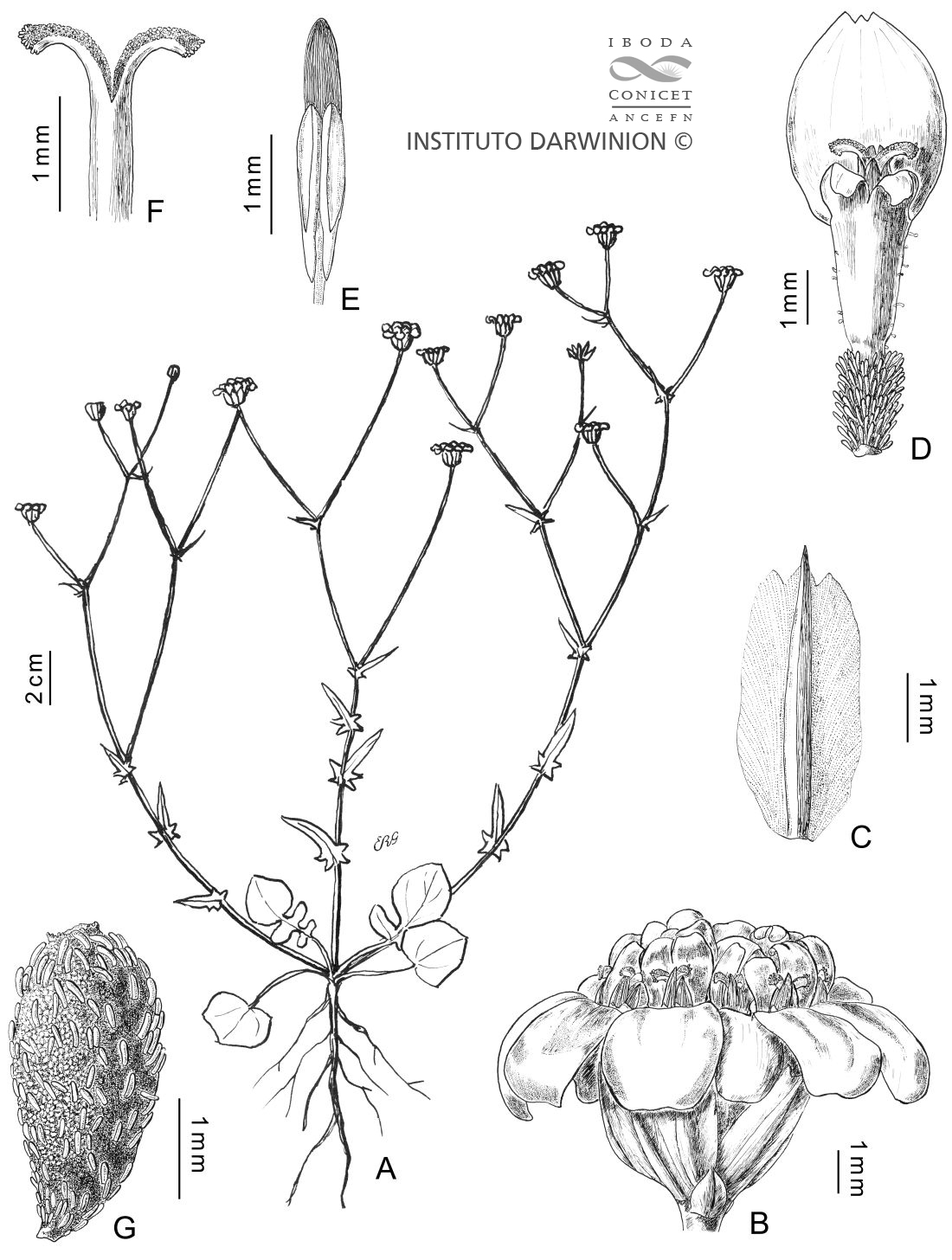 A. Planta. B. Capítulo. C. Filario. D. Flor. E. Estambre. F. Parte superior del estilo. G. Aquenio.