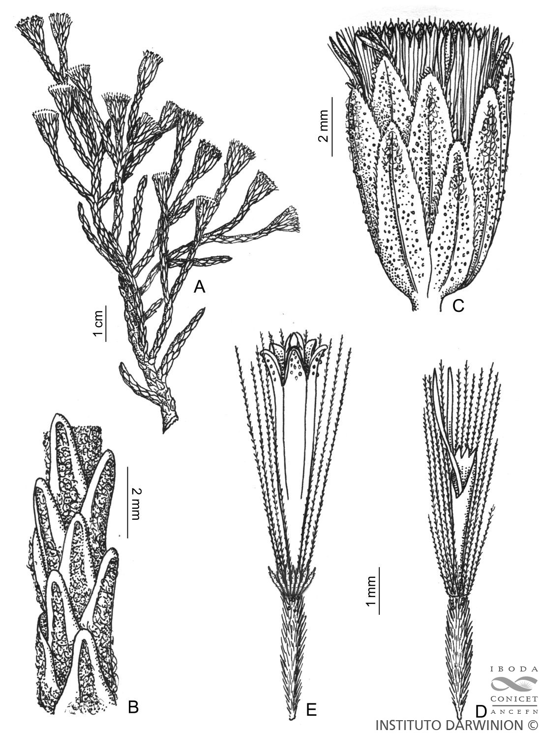 Arbustos de 0,2-1,5 m de alto, ramas dispuestas en forma densa a laxa. Hojas de 2,5-4 × 1-2 mm. Involucros de 6,5-8,5 × 3- 4 mm; filarios externos de 4-5,5 × 1,2-1,6 mm, los internos de 5-6 × 1-2 mm. Flores del margen 5-12, con corolas filiformes, tubos de 2-2,5 mm de largo, limbo de 0,5-1 mm de largo. Flores del centro 7-15, con corolas tubulosas, tubos de 4-4,5 mm de largo, lóbulos de 0,8-1 × 0,5-0,8 mm; tecas ca. 2,5 mm de largo; ejes de los estilos ca. 4,5 mm de largo; ramas del estilo ca. 1,5 mm de largo. Aquenios de 2-3 mm de largo. Papus de las flores marginales de 4,5- 5,5 mm de largo, cerdas exteriores algo menores; papus de las flores del centro de 5-5,5 mm de largo, pajitas de la serie exterior de 1-2 mm de largo.