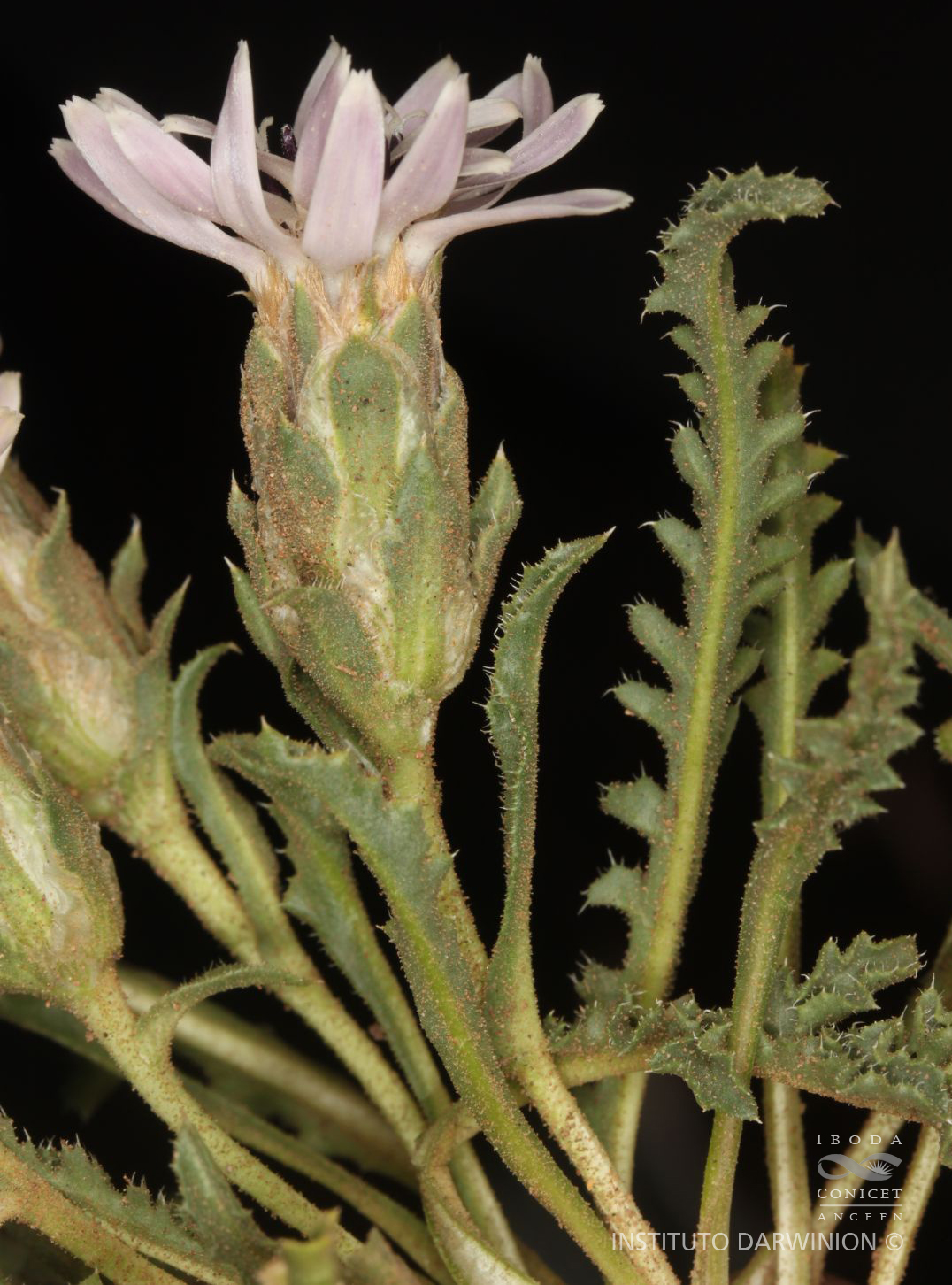 Hierbas acaules, de 4-20 cm de alto, glanduloso-pubescentes. Hojas inferiores dispuestas en roseta a subarrosetadas, a veces rodeadas por restos de pecíolos de hojas viejas y secas, oblanceoladas o lanceoladas, de 4-21 × 0,5-3,8 cm, atenuadas en la base, mucronadas, leve- a profundamente lobadas, lóbulos lacerados, espinoso-dentados, margen crespo y festoneadoenrulado, glanduloso-pubescentes; hojas superiores más o menos numerosas, desarrolladas, lanceoladas. Capítulos solitarios o 2-6 formando cimas corimbosas, sobre 1-10 escapos. Involucro de 14-27 × 15-33 mm; filarios 3-4-seriados, glanduloso-pubescentes, los externos muy anchos, oblongos a espatulados, levemente dentados, con espinas largas en el ápice y en el margen, los más internos lanceolados, con margen notablemente escarioso, espinosos sólo en el ápice. Flores 25-50, corola azul, violácea, blanca, castaña o amarillenta, las del margen con tubo de 10-13 mm de largo, labio exterior de 5-8 mm de largo. Aquenios levemente rostrados en el ápice, glabros o híspidos, con tricomas rojobroncíneos. Papus de 12-15 mm de largo, blanco, leonado o rosado.