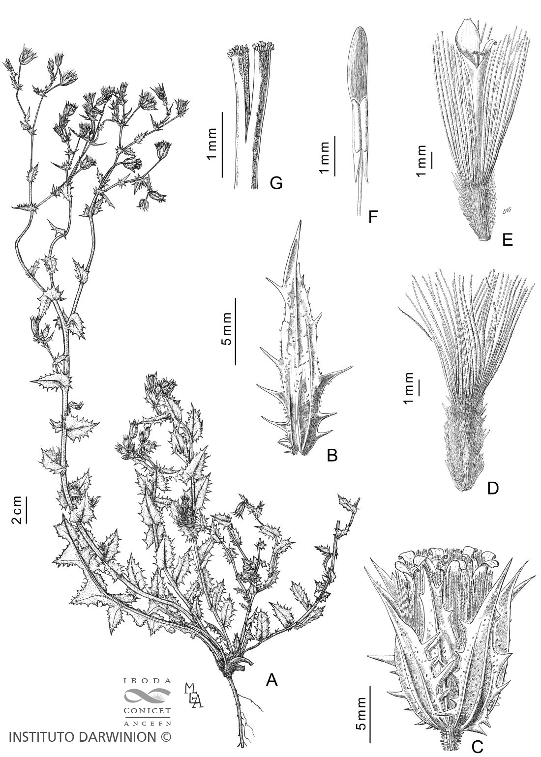 A. Planta. B. Filario externo. C. Capítulo. D. Aquenio y papus. E. Flor. F. Estambre. G. Parte superior del estilo.