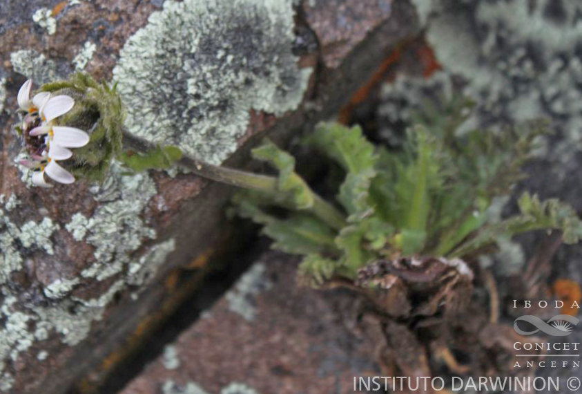 Montañas del extremo sur continental de Chile y Argentina, en la provincia de Santa Cruz. Crece en las grietas de las rocas hasta los 1200 m s. m.