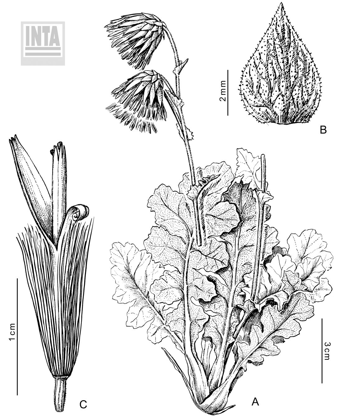 Hierbas caulescentes, robustas, de 25-85 cm alto, cortamente glanduloso-pubescentes. Hojas inferiores dispuestas en roseta, sésiles o atenuadas en la base en corto pecíolo envainador, anchamente oblanceoladas, grandes, de 8-31 × 2,5-10 cm, liradopinnatífidas, lóbulos ovados, lobados o dentados en el margen, dientes mucronados o mucronado-espinulosos, glabras en ambas caras; hojas superiores pocas, bien desarrolladas, a veces pequeñas, lanceoladas. Capítulos generalmente 4-10, nutantes, dispuestos en una cima racemiforme o paniculiforme laxa. Involucro de 12-22 × 10-30 mm; filarios 3-5-seriados, ovados a linear-lanceolados, atenuados en la parte superior, mucronados en el ápice, margen entero, glanduloso-pubescentes, los internos tanto o más largos que el papus. Flores 20-30, corola violácea, lavanda o púrpura, las del margen con tubo de 6-12 mm de largo, labio exterior de 8-10 mm de largo. Aquenios cortamente rostrados en el ápice, laxamente pilosos, con tricomas rojo-broncíneos. Papus de 8-18 mm de largo, leonado o rojizo.