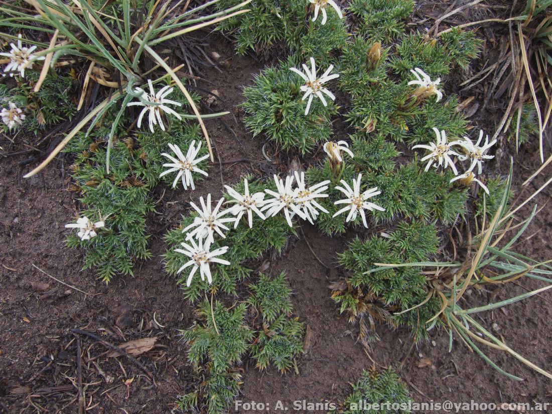Hierbas acaules, de 2-15 cm de alto, a veces formando extensas matas por desarrollo de braquiblastos a partir del rizoma, glabras. Hojas dispuestas en roseta a subarrosetadas, sésiles, numerosas y muy apretadas, linear-oblongas, de 1,2-8,5 × 2-2,5 cm, envainadoras en la base, agudas en el ápice, profundamente pectinado-pinnatisectas, con lóbulos numerosos, lineares, enteros o partidos, terminados en una larga cerda o espina blanca, láminas a veces enteras con largas cerdas blancas marginales, glabras en ambas caras, tuberculado-punteadas en la haz; hojas superiores escasas, bracteiformes, linear-pectinadas, usualmente ocultas por las hojas inferiores. Capítulos solitarios, casi ocultos entre las hojas o sobre 1-2 escapos cortos, que sobrepasan o no a las hojas inferiores. Involucro de 12-20 × 8-20 mm; filarios 2-4- seriados, lanceolados, oblongos, agudos, margen escarioso, glabros, las externos espinosos o con cerdas filiformes, por los márgenes escariosos rotos, los más internos enteros. Flores 10- 20, corola azul, rosada o blanca, las del margen con tubo de 8-10 mm de largo, labio exterior de 5-10 mm de largo. Aquenios truncados en el ápice, densamente velludos, con tricomas dorados. Papus de 10-16 mm de largo, blanco o leonado..