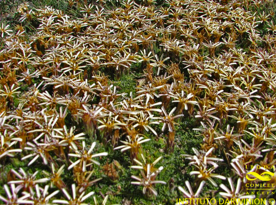 Hierbas acaules, de 2-15 cm de alto, a veces formando extensas matas por desarrollo de braquiblastos a partir del rizoma, glabras. Hojas dispuestas en roseta a subarrosetadas, sésiles, numerosas y muy apretadas, linear-oblongas, de 1,2-8,5 × 2-2,5 cm, envainadoras en la base, agudas en el ápice, profundamente pectinado-pinnatisectas, con lóbulos numerosos, lineares, enteros o partidos, terminados en una larga cerda o espina blanca, láminas a veces enteras con largas cerdas blancas marginales, glabras en ambas caras, tuberculado-punteadas en la haz; hojas superiores escasas, bracteiformes, linear-pectinadas, usualmente ocultas por las hojas inferiores. Capítulos solitarios, casi ocultos entre las hojas o sobre 1-2 escapos cortos, que sobrepasan o no a las hojas inferiores. Involucro de 12-20 × 8-20 mm; filarios 2-4- seriados, lanceolados, oblongos, agudos, margen escarioso, glabros, las externos espinosos o con cerdas filiformes, por los márgenes escariosos rotos, los más internos enteros. Flores 10- 20, corola azul, rosada o blanca, las del margen con tubo de 8-10 mm de largo, labio exterior de 5-10 mm de largo. Aquenios truncados en el ápice, densamente velludos, con tricomas dorados. Papus de 10-16 mm de largo, blanco o leonado..