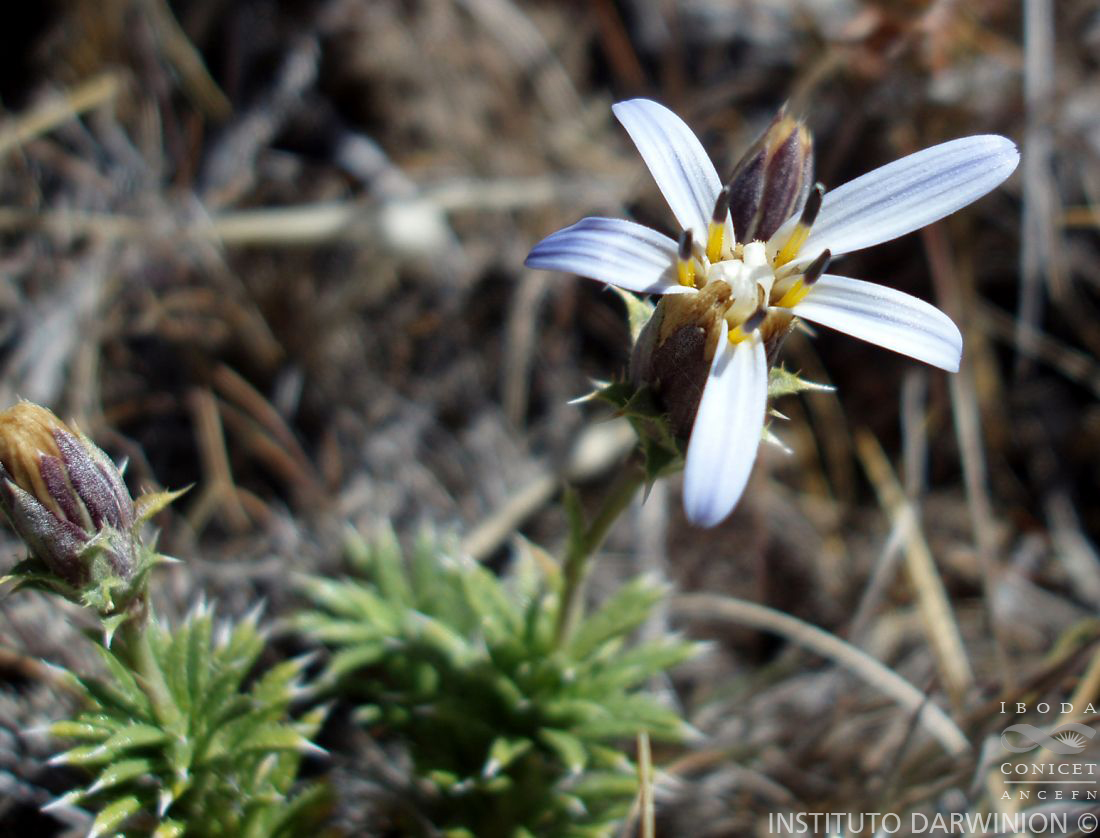 Hierbas acaules, de 5-30 cm de alto, a veces formando matas por desarrollo de braquiblastos o de un macroblasto basal a partir del rizoma, glanduloso-pubescentes. Hojas inferiores dispuestas en roseta o subarrosetadas, muy numerosas, apretadas, sésiles, oblanceolado-lineares, de 0,5-4 cm × 1,5-2 mm, ensanchadas en una vaina corta y ciliada en su base, agudas en el ápice, mucronadas o espinosas, enteras u ocasionalmente dentadas, revolutas en el margen originando un surco abaxial, sin espinas o provistas de una hilera de espinitas cortas de 0,5- 1 mm a cada lado sobre el falso borde de la hoja enroscada o con espinas conspicuas hasta de 2 mm de largo, glabras en la cara superior, glanduloso-pubescentes en el envés, que queda oculto al enroscarse la hoja; hojas superiores escasas a numerosas, espaciadas, bracteiformes, lineares. Capítulos solitarios ó 2-4, en el extremo de 1-3 tallos floríferos. Involucro cilíndrico o acampanado, de 14-25 × 5-15 mm; filarios 3-5-seriados, mucronados, glanduloso-pubescentes, los externos ovadooblongos, agudos, espinuloso-ciliados o espinosos en el margen, los internos lanceolados, generalmente sin espinitas marginales, con margen escarioso. Flores 10-30, corola azul, blanca, amarilla o crema, las del margen con tubo de 5-8 mm de largo, labio exterior de 6-10 mm de largo. Aquenios truncados en el ápice o algo redondeados, glanduloso-pubescentes, con tricomas blanquecinos. Papus de 11-15 mm de largo, leonado.