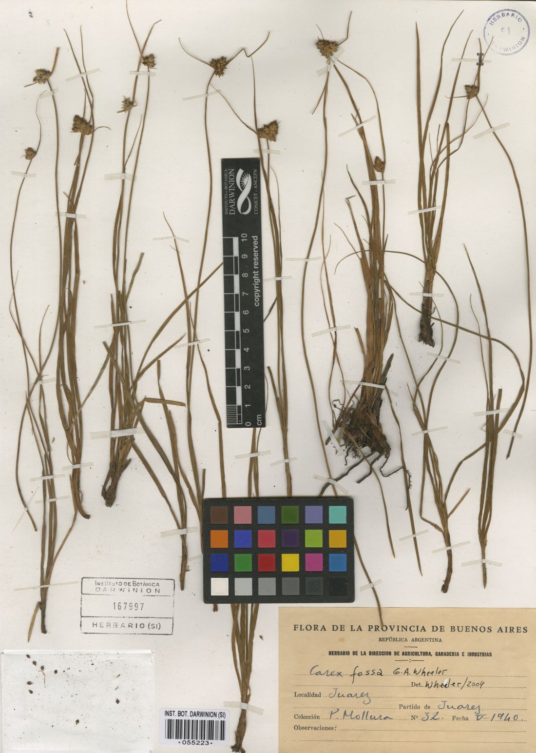 Observaciones: Iconography: Figures 1C, 2E, 3E. Additional figures in Boott (1858–1867: tabs. 209–2010, as Carex involucrata) and Barros (1935: 202, as C. sororia?). Etymology: From the Latin fossa, literally, ditch or pit, a term chosen by Wheeler (2002) to refer to the ‘weedy’ habitat of this species, often occurring in roadside verges, ditches or along railroad embankments. Notes: The illegitimate name Carex involucrata Boott remained in synonymy under C. sororia until Wheeler (2002) resurrected the taxon with the new name C.fossa. He presented a putative combination of characters including utricles and inflorescences distinctive of C. fossa and reported the species as occurring from the Argentinian Patagonia north to Salta, Paraguay and Uruguay. Wheeler did not study any actual voucher from the northern areas, and he entirely relied on bibliographic records reporting C. involucrata from there. He also mentioned a doubtful entity from northern Argentina and southern Brazil, C. sororia var. pseudobracteosa (Kük.) Kük., somehow intermediate between what he considered C. fossa and C. sororia. We have studied vouchers identified by Wheeler as C. fossa from the entire area, including Paraguay, Uruguay and Brazil. Whereas the specimens from the southern half of the range seems to us to be more or less constant and distinct from C. sororia, we agree with Wheeler that the delimitation of C. fossa becomes much problematic in the northern part of