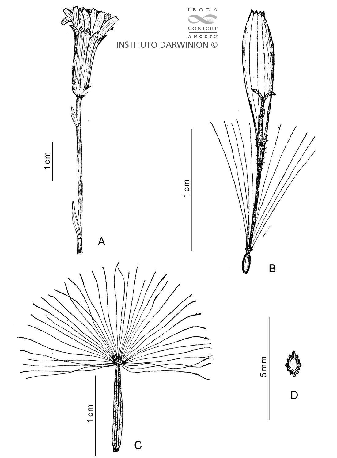 A. Rama florífera. B. Flor. C. Aquenio y papus. D. Aquenio, corte transversal.
