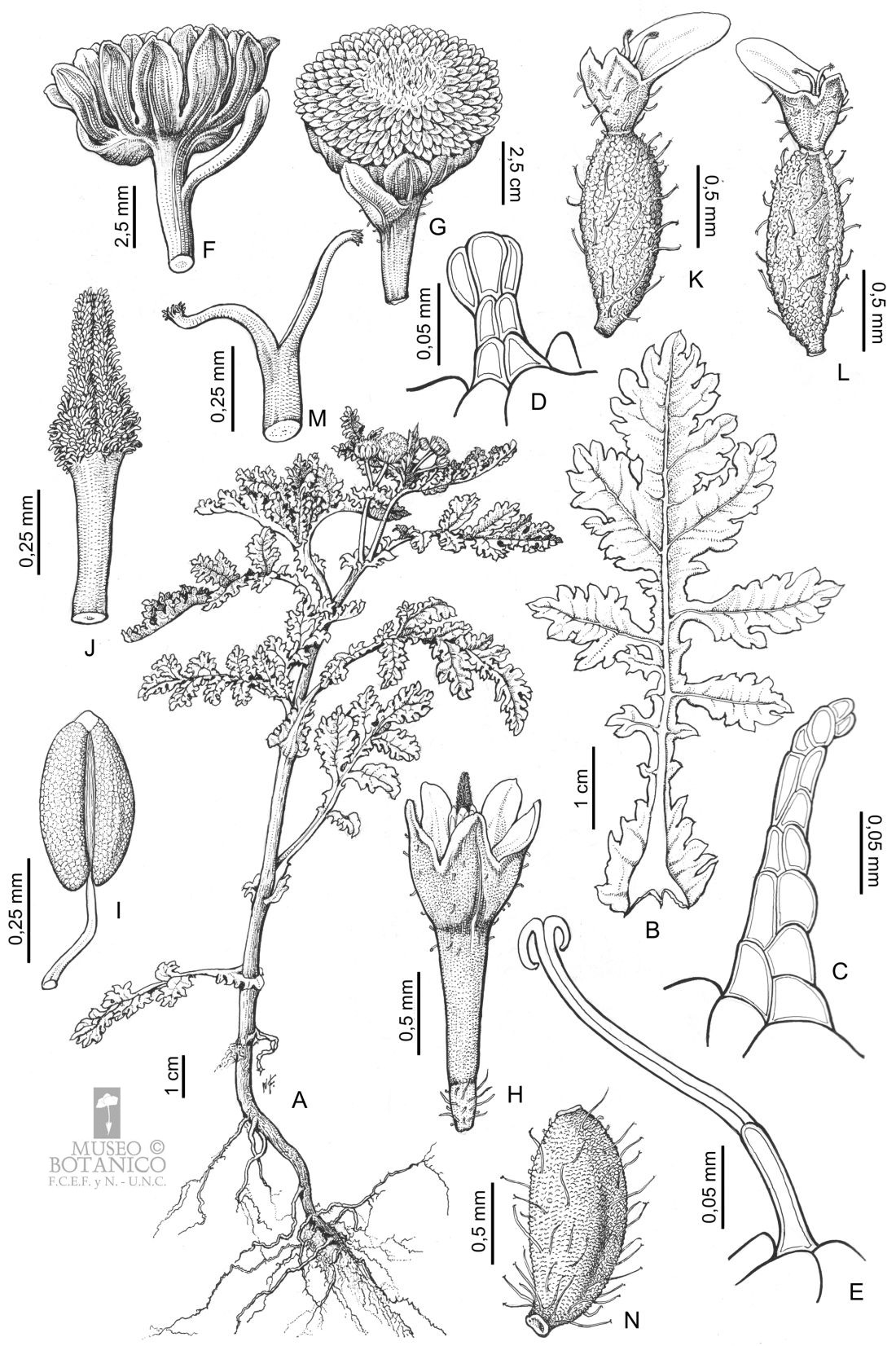 A. Planta. B. Hoja. C, D, E. Tricomas. F. Capítulo, vista lateral. G. Capítulo, vista superior. H. Flor del centro. I. Estambre. J. Estilo de flor del centro. K, L. Flores del margen. M. Estilo de flor del margen. N. Aquenio.