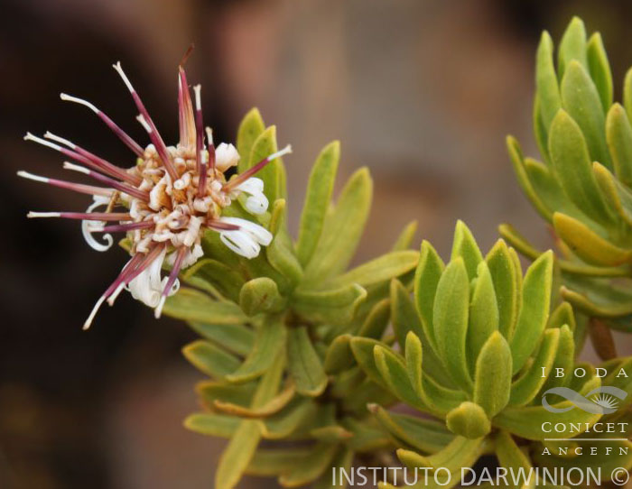 Arbustos de 0,50-1 m de alto; ramas viejas desnudas con cicatrices foliares marcadas, ramas jóvenes densamente hojosas. Hojas alternas, pequeñas, obovado-oblongas, de 14-20 × 2-3,5 mm, atenuadas en la base, agudo-mucronadas en el ápice, enteras en el margen, subcoriáceas, tomentosas hasta glabrescentes en ambas caras. Capítulos solitarios en la parte superior de las ramitas, sésiles y rodeados por las hojas. Involucro acampanado, de 15-20 × 10-14 mm; filarios 3-4-seriados, oblongo-elípticos, pubescentes en el dorso, los internos ligeramente más largos y atenuados en la parte superior. Flores del margen 5-10, perfectas, corolas bilabiadas con tubo de 8-9 mm de largo, labio externo oblongo, 3-dentado, de 8-10 mm de largo y labio interno 2-fido con lóbulos enroscados; flores del centro 7-12, corolas tubulosas, profundamente 5-sectas, tubo ca. 12 mm de largo, con segmentos lineares, ca. 5 mm de largo, recurvados. Aquenios cilindroides, ca. 4 mm de largo, sólo con escasos pelos en la parte apical. Papus amarillento, hasta de 13 mm de largo.