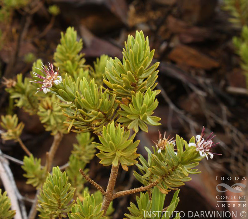 Arbustos de 0,50-1 m de alto; ramas viejas desnudas con cicatrices foliares marcadas, ramas jóvenes densamente hojosas. Hojas alternas, pequeñas, obovado-oblongas, de 14-20 × 2-3,5 mm, atenuadas en la base, agudo-mucronadas en el ápice, enteras en el margen, subcoriáceas, tomentosas hasta glabrescentes en ambas caras. Capítulos solitarios en la parte superior de las ramitas, sésiles y rodeados por las hojas. Involucro acampanado, de 15-20 × 10-14 mm; filarios 3-4-seriados, oblongo-elípticos, pubescentes en el dorso, los internos ligeramente más largos y atenuados en la parte superior. Flores del margen 5-10, perfectas, corolas bilabiadas con tubo de 8-9 mm de largo, labio externo oblongo, 3-dentado, de 8-10 mm de largo y labio interno 2-fido con lóbulos enroscados; flores del centro 7-12, corolas tubulosas, profundamente 5-sectas, tubo ca. 12 mm de largo, con segmentos lineares, ca. 5 mm de largo, recurvados. Aquenios cilindroides, ca. 4 mm de largo, sólo con escasos pelos en la parte apical. Papus amarillento, hasta de 13 mm de largo.