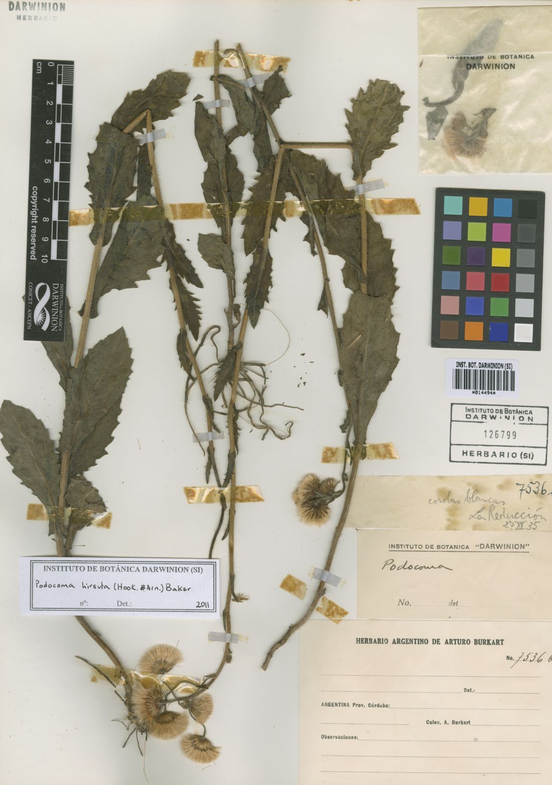Hierbas hasta de 1 m de alto, rizomatosas; tallos simples, hojosos, hirsutos. Hojas progresivamente reducidas hacia el ápice, hirsutas en ambas caras, las inferiores e intermedias elípticas, de 6-18 × 2,5-7 cm, base atenuada, subauriculada y levemente abrazadora, ápice subagudo a agudo y margen serrado a profundamente serrado; las superiores lanceoladas, reducidas, de 3-4 × 0,5-1 cm, de base abrazadora, ápice agudo, margen profundamente serrado en el ápice. Capítulos 3 a 30 por eje, ca. 10 × ca. 8 mm, pedunculados. Involucro ampliamente campanulado; filarios desiguales dispuestos en 4 ó 5 series, linearovados a linear-elípticos, de 3-8 × 0,5-0,6 mm, agudos, subglabros. Flores marginales en 3 ó 4 series, con corola, ca. 8 mm de largo, limbo de 1,5-2,5 mm; flores del centro con corolas de 6-6,5 mm de largo. Aquenios de 6-7 × ca. 1 mm, rostro de 2,5-3,5 mm de largo, seríceos. Papus ca. 9 mm de largo, formado por 2 ó 3 series de cerdas desiguales.