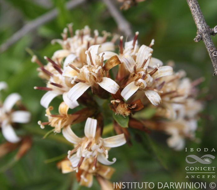Arbustos de 1-2,5 m de alto, intrincado-ramosos, con ramas muy abiertas, espiniformes, laxamente hojosas, glabras. Hojas rígidas, cortamente pecioladas, con láminas elípticas, ovadooblongas, elíptico-oblongas o espatuladas, de 2-6 × 0,5-1,5 cm, atenuadas en la base, apiculadas o emarginadas en el ápice, enteras, apenas denticuladas o espinoso-dentadas en el margen, nervadura central muy conspicua, nervaduras laterales poco manifiestas, glabras en ambas caras o apenas pubérulas o lanosas en el envés, principalmente sobre la vena media. Capítulos numerosos, dispuestos en glomérulos agrupados en una inflorescencia racemiforme, con eje principal y ejes secundarios rígidos, a veces deviniendo en espinas ramificadas muy rígidas. Involucro de 5-6 mm de alto; filarios glabros, castaño-rojizos, los externos ovados, los internos lanceolado-ovados. Flores 5-6, corola blanca, de 10-12 mm de largo. Aquenios turbinados, densamente pubescentes. Papus blanco o blanco-amarillento, cerdas denticuladas, de 10-12 mm de largo.
