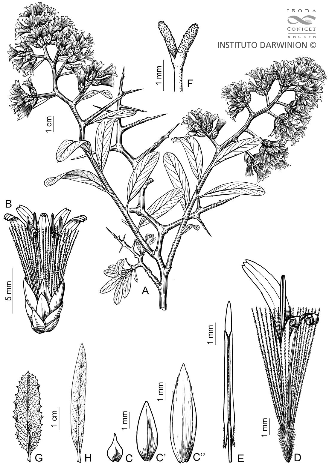 Arbustos de 1-2,5 m de alto, intrincado-ramosos, con ramas muy abiertas, espiniformes, laxamente hojosas, glabras. Hojas rígidas, cortamente pecioladas, con láminas elípticas, ovadooblongas, elíptico-oblongas o espatuladas, de 2-6 × 0,5-1,5 cm, atenuadas en la base, apiculadas o emarginadas en el ápice, enteras, apenas denticuladas o espinoso-dentadas en el margen, nervadura central muy conspicua, nervaduras laterales poco manifiestas, glabras en ambas caras o apenas pubérulas o lanosas en el envés, principalmente sobre la vena media. Capítulos numerosos, dispuestos en glomérulos agrupados en una inflorescencia racemiforme, con eje principal y ejes secundarios rígidos, a veces deviniendo en espinas ramificadas muy rígidas. Involucro de 5-6 mm de alto; filarios glabros, castaño-rojizos, los externos ovados, los internos lanceolado-ovados. Flores 5-6, corola blanca, de 10-12 mm de largo. Aquenios turbinados, densamente pubescentes. Papus blanco o blanco-amarillento, cerdas denticuladas, de 10-12 mm de largo.