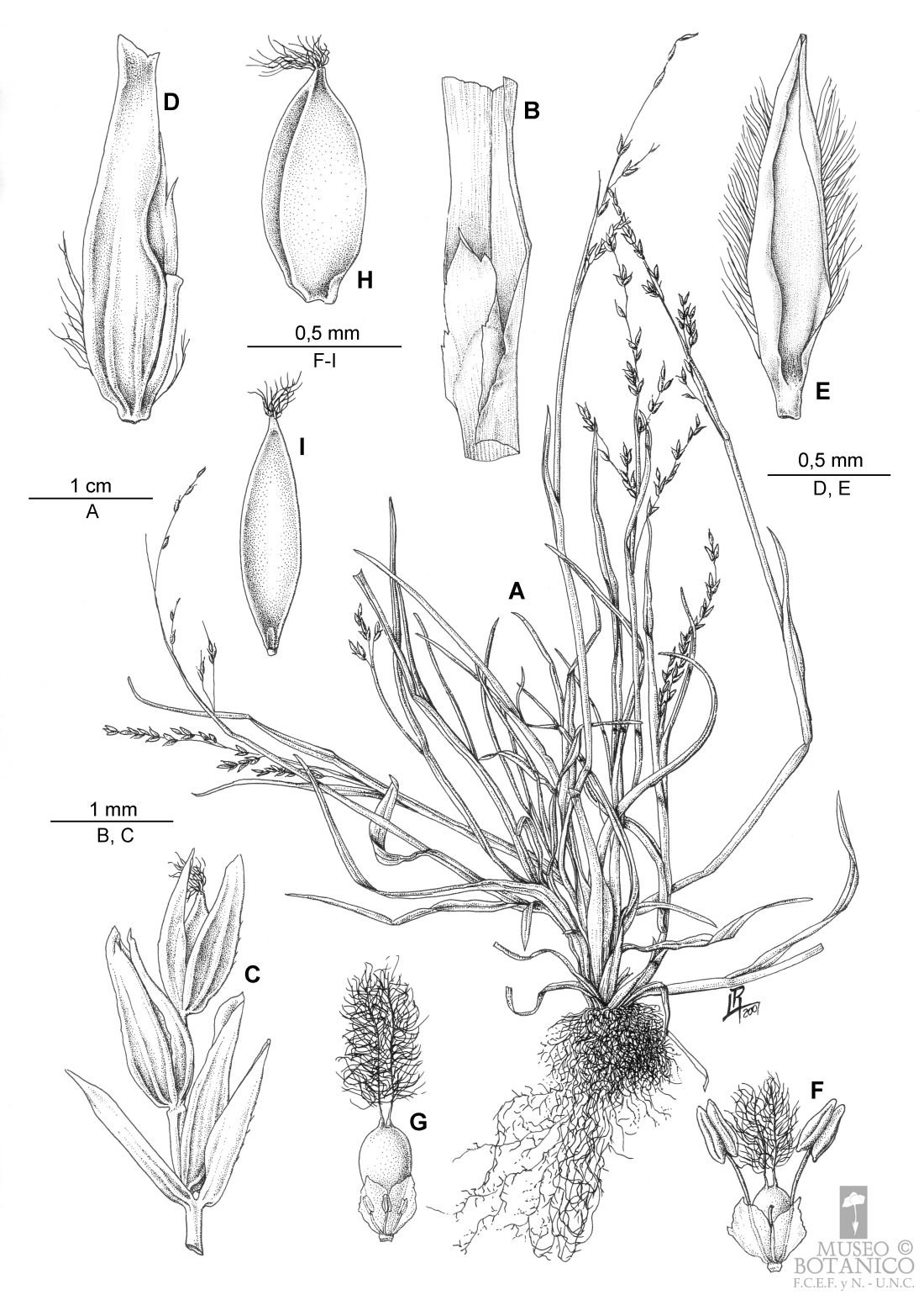 A, hábito; B, lígula; C, espiguilla; D, antecio; E, lemma; F, flor perfecta con lodículas; G, flor pistilada con estaminodios y lodículas; H-I, cariopsis vista lateral e hilar.