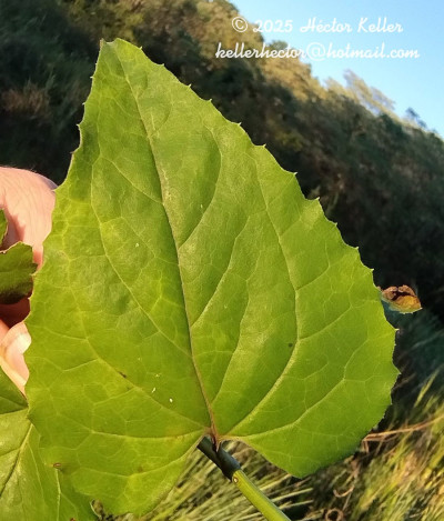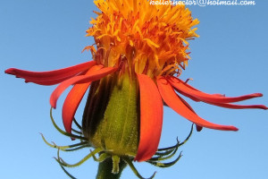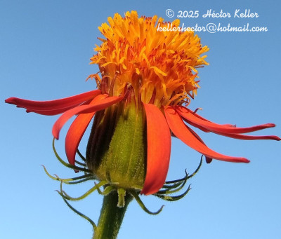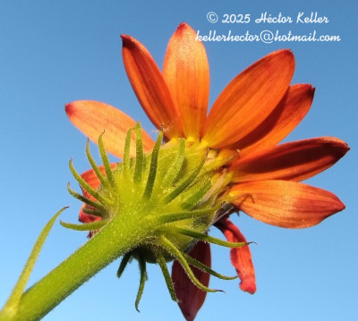 Arbustos apoyantes o volubles, de 2-4 m de alto, glabros o pubérulos. Tallos laxamente hojosos. Hojas largamente pecioladas; pecíolos de 1-3 cm de largo; láminas ovadas, de 6-10 × 3-7 cm, redondeadas o cordadas en la base, acuminadas en el ápice, dentadas en el margen, puberulentas o glabras en ambas caras. Capítulos radiados, largamente pedunculados, solitarios o en cimas de 2-5 en los ápices de los tallos. Involucro acampanado, de 10-12 × 12-15 mm, caliculado; filarios 20-22, linearoblongos, agudos en el ápice, glabros en el dorso; brácteas del calículo numerosas, lineares, pubérulas, alcanzando la mitad del involucro. Flores con corolas anaranjado-intenso o rojo, las del margen con lígula elíptica, de 10-12 × 3,5 mm, las del centro numerosas, con corola tubulosa. Aquenios pubescentes, ca. 4 mm de largo. Papus blanco..