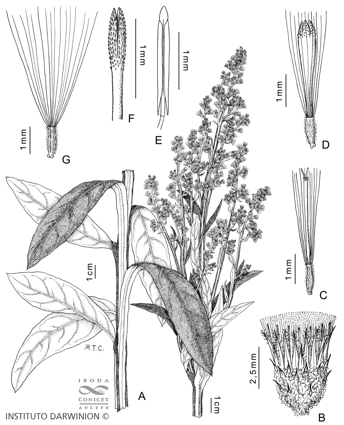 Hierbas perennes, de 0,6-1,2 m de alto, con xilopodio delgado o ausente; tallos erectos, simples en la base y ramificado en la parte superior, alados, con alas discoloras ca. 3 mm de ancho, uniformemente hojoso hasta la inflorescencia, densamente gríseo-ocráceo-lanoso. Hojas inferiores obovado-elípticas, de 8-15 × 1,5-4 cm, atenuadas y decurrentes en la base, agu-das y mucronadas en el ápice, menudamente aserradas en el margen, discoloras, glabrescentes y oscuras en la cara superior y densamente gríseo-ocráceas y lanosas en la inferior; hojas superiores lanceoladas u oblongo-lanceoladas, de 5-12 × 1-2,4 cm. Capítulos numerosos, dispuestos en racimos amplios o en panojas de espigas laxas de 15-28 × 7-8 cm. Involucro cilíndrico, de 5-6 mm de alto; filarios ca. 50, los externos angostamente ovados, largamente acuminados, lanosos en el dorso, los internos lineares, agudos, apenas pilosos en el ápice. Receptáculo glabro. Flores del margen ca. 88, pistiladas, con corola filiforme de 2,5-3 mm de largo; flores del centro 3-5, estaminadas, con corola tubulosa de 2,5-3 mm de largo, 5-lobada. Aquenios costados, de 0,5-0,9 mm de largo, velludo-glandulosos. Papus blancuzco, ligeramente más largo que la corola, de 3-3,2 mm de largo.