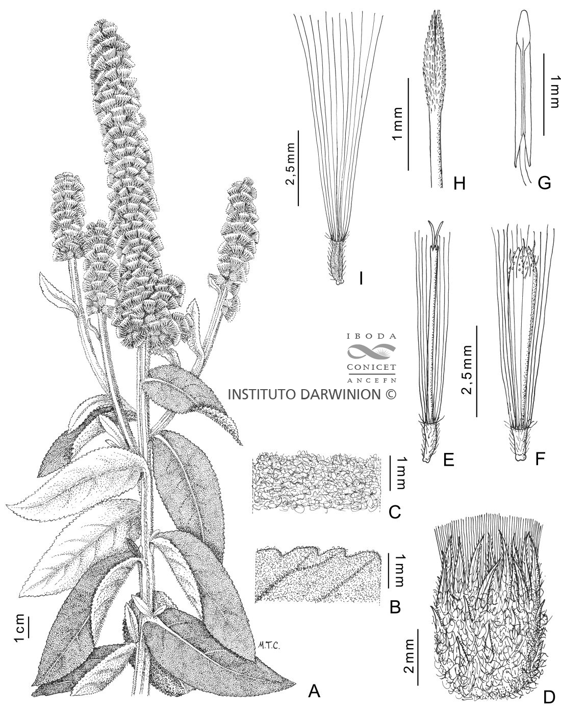 Hierbas perennes, de 0,5-1,2 m de alto, con xilopodio desarrollado; tallos erectos, ramificados en la parte superior, alados, con alas discoloras, de 1,5-2 mm de ancho, uniformemente hojosos hasta la inflorescencia, densamente ocráceo o rosado-lanosos. Hojas ovado-elípticas u oblongo-elípticas, de 8-11,5 × 3,5-5 cm, cuneiformes y decurrentes en la base, agudas y mucronadas en el ápice, menudamente aserradas en el margen, discoloras, más o menos tomentosas y oscuras en la cara superior y densamente lanosas, amarillo-crema a rosado-ocráceas en la inferior; hojas superiores gradualmente menores. Capítulos numerosos, dispuestos en espigas alargadas, densas, de 6-18 × 2-2,5 cm. Involucro cilíndrico, de 5-7 mm de alto; filarios ca. 40, los externos angostamente ovados, agudos, lanosos en el dorso, los internos lineares, apiculados, apenas pilosos en el ápice. Receptáculo glabro. Flores del margen 57-77, pistiladas, con corola filiforme de 3 mm de largo; flores del centro 1-2, estaminadas, con corola tubulosa de 3 mm de largo, 5-lobada. Aquenios costados, ca. 1 mm de largo, velludo-glandulosos. Papus blancuzco, ligeramente más largo que la corola, de 4 mm de largo.