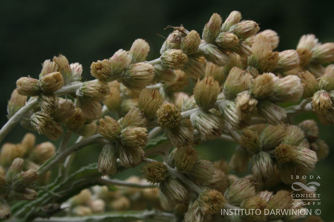 Hierbas perennes, de 0,5-1,2 m de alto, con xilopodio desarrollado; tallos erectos, ramificados en la parte superior, alados, con alas discoloras, de 1,5-2 mm de ancho, uniformemente hojosos hasta la inflorescencia, densamente ocráceo o rosado-lanosos. Hojas ovado-elípticas u oblongo-elípticas, de 8-11,5 × 3,5-5 cm, cuneiformes y decurrentes en la base, agudas y mucronadas en el ápice, menudamente aserradas en el margen, discoloras, más o menos tomentosas y oscuras en la cara superior y densamente lanosas, amarillo-crema a rosado-ocráceas en la inferior; hojas superiores gradualmente menores. Capítulos numerosos, dispuestos en espigas alargadas, densas, de 6-18 × 2-2,5 cm. Involucro cilíndrico, de 5-7 mm de alto; filarios ca. 40, los externos angostamente ovados, agudos, lanosos en el dorso, los internos lineares, apiculados, apenas pilosos en el ápice. Receptáculo glabro. Flores del margen 57-77, pistiladas, con corola filiforme de 3 mm de largo; flores del centro 1-2, estaminadas, con corola tubulosa de 3 mm de largo, 5-lobada. Aquenios costados, ca. 1 mm de largo, velludo-glandulosos. Papus blancuzco, ligeramente más largo que la corola, de 4 mm de largo.