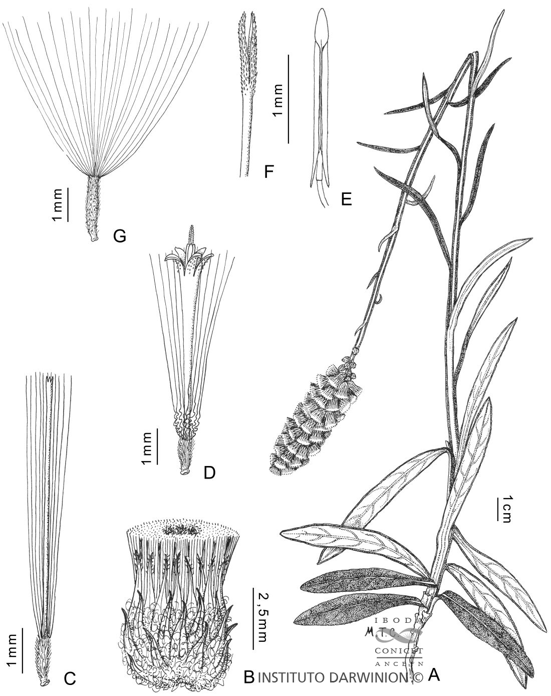 Hierbas perennes, de 0,4-1,5 m de alto, con xilopodio grueso; tallos primero ascendentes y luego erectos, ocasionalmente ramificados en la base o en la parte superior, alados, con alas discoloras, de 2-3(-4) mm de ancho, con hojas amontonadas en la base y más laxamente hojosos en la parte superior, densamente blanco-lanoso. Hojas inferiores oblanceoladas, de 6,5-11 × 0,6- 2 cm, atenuadas y decurrentes en la base, agudas y mucronadas en el ápice, enteras y revolutas en el margen, discoloras, glabras, brillantes y oscuras en la cara superior y densamente blancolanosas en la inferior; hojas superiores gradualmente menores. Capítulos numerosos, dispuestos en espigas alargadas, densas, algunas veces discontinuas en la base, de 5-20 × 0,8-2 cm. Involucro cilíndrico, de 4,5-6 mm de alto; filarios ca. 50, los externos ovados, acuminados, lanosos en el dorso, los internos lineares, agudos, apenas pilosos. Receptáculo glabro. Flores del margen 74-113, pistiladas, con corola filiforme de 5 mm de largo; flores del centro 3-6, estaminadas, con corola tubulosa de 5 mm de largo, 5-lobada. Aquenios costados, de 1-1,2 mm de largo, velludo-glandulosos. Papus blancuzco, ligeramente más largo que la corola, de 5,5-6 mm de largo.