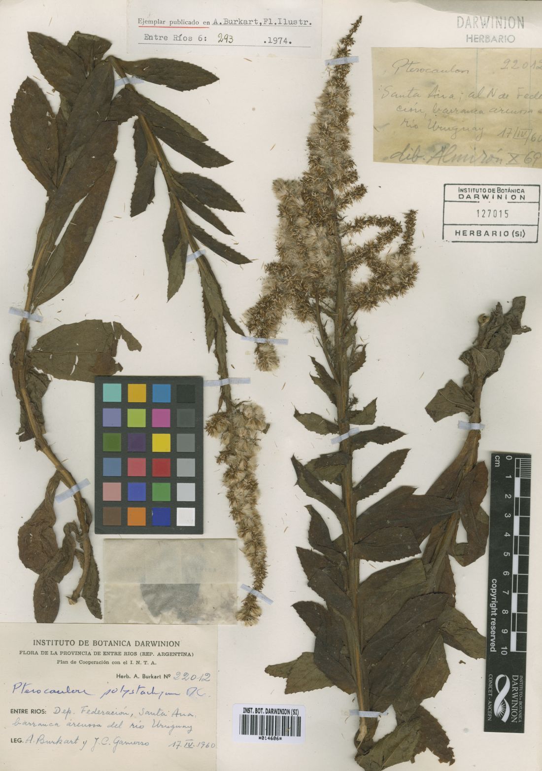 Hierbas perennes, de 1-2 m de alto, con xilopodio grueso; tallos erectos, ramificados en la parte superior, alados, alas ca. 3 mm de ancho, uniformemente hojosos hasta la inflorescencia, cubiertos de pelos glandulares cortos. Hojas inferiores obovadas u ovado lanceoladas, de 5-10 × 1,5-4 cm, atenuadas y decurrentes en la base, subobtusas a agudas y mucronadas en el ápice, aserradas en el margen, concoloras, oscuras en ambas caras y cubiertas de pelos glandulares sésiles y pedunculados, las hojas superiores gradualmente menores. Capítulos numerosos, dispuestos en racimos espiciformes laxos, formando en conjunto una panoja triangular de 15-30 × 7-20 cm. Involucro cilíndrico, de 4-5 mm de alto; filarios ca. 50, los externos ovados, acuminados, glandulosos en el dorso, los internos lineares, agudos, subglabros. Receptáculo glabro. Flores del margen 99-106, pistiladas, con corola filiforme de 3 mm de largo; flores del centro 3-4, estaminadas, con corola tubulosa de 3 mm de largo, 5-lobada. Aquenios costados, ca 0,9 mm de largo, velludo-glandulosos. Papus blancuzco, tan largo como la corola, ca. 4 mm de largo.