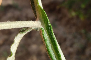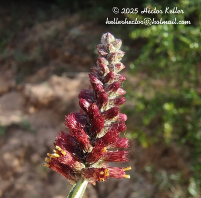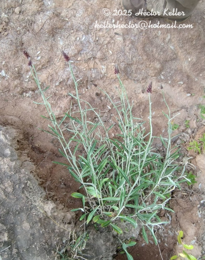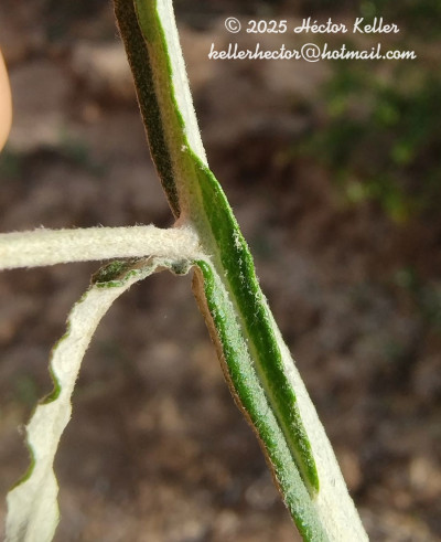 Hierbas perennes, de 30-70 cm de alto, con xilopodio grueso; tallos varios, erectos o ascendentes, alados, con alas discoloras, de 1-1,5 mm de ancho, laxa y uniformemente hojosos hasta la inflorescencia, densamente gríseo-lanosos. Hojas inferiores obovadas, de 4-8 × 1,5-3,5 cm, atenuadas y decurrentes en la base, obtusas en el ápice, enteras en el margen, discoloras, glabras y lisas en la cara superior y densamente gríseo-lanosas en la inferior; hojas superiores elípticas, gradualmente menores. Capítulos numerosos, dispuestos en espigas ovoides, densas, hasta de 4 × 1,5 cm. Involucro cilíndrico, de 4-5 mm de alto; filarios ca. 50, purpurescentes en la parte superior, los externos ovados, obtusos, lanosos en el dorso, los internos lineares, acuminados, subglabros. Receptáculo glabro. Flores del margen ca. 30, pistiladas, con corola filiforme de 2-2,5 mm de largo; flores del centro 3-6, estaminadas, con corola tubulosa de 2-2,5 mm de largo, profundamente 5-lobada. Aquenios costados, ca. 1 mm de largo, velludo-glandulosos. Papus blancuzco, tan largo como la corola, de 2,5-3 mm de largo.