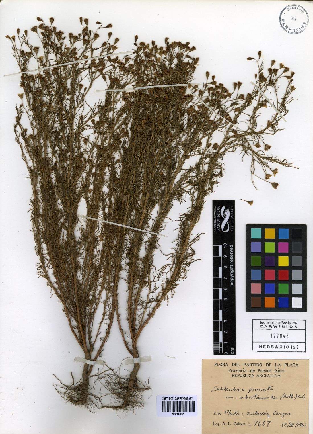 Observaciones: Nombres vulgares y usos. «Canchalagua», «escoba», «escobilla», «Jayac pichana», «matalahúga», «matapulgas», «pichana», «pichana amarga», «pillaguay», «yuyo amargo». Presenta propiedades insecticida, antimalaria, antifúngica, antimicrobiana y, en infusión, como depurativo y adelgazante. Se ha citado su uso casero para ahuyentar insectos, especialmente pulgas. Con sus ramas se fabrican escobas o escobillas. Para el presente trabajo no han podido estudiarse materiales de la provincia de Neuquén (Conticello & Bustamante, 1999; Zuloaga et al., 2008). El caso de las variedades establecidas para S. pinnata la situación es similar a la planteada para S. multiflora. Algunos autores (por ejemplo, Heiser, 1945; Cabrera, 1963) diferencian las variedades abrotanoides, octoaristata y pinnata y, por el contrario, otros consideran que el carácter utilizado para su separación (papus mútico o aristado) forma parte de la variabilidad de la especie, sin necesidad de reconocer categorías infraespecíficas (Petenatti & Ariza Espinar, 1997; Gutiérrez en Zuloaga et al., 2008; Katinas & Gutiérrez, 2013). En el presente trabajo se sigue este último criterio. Se comporta como una maleza anual poco agresiva