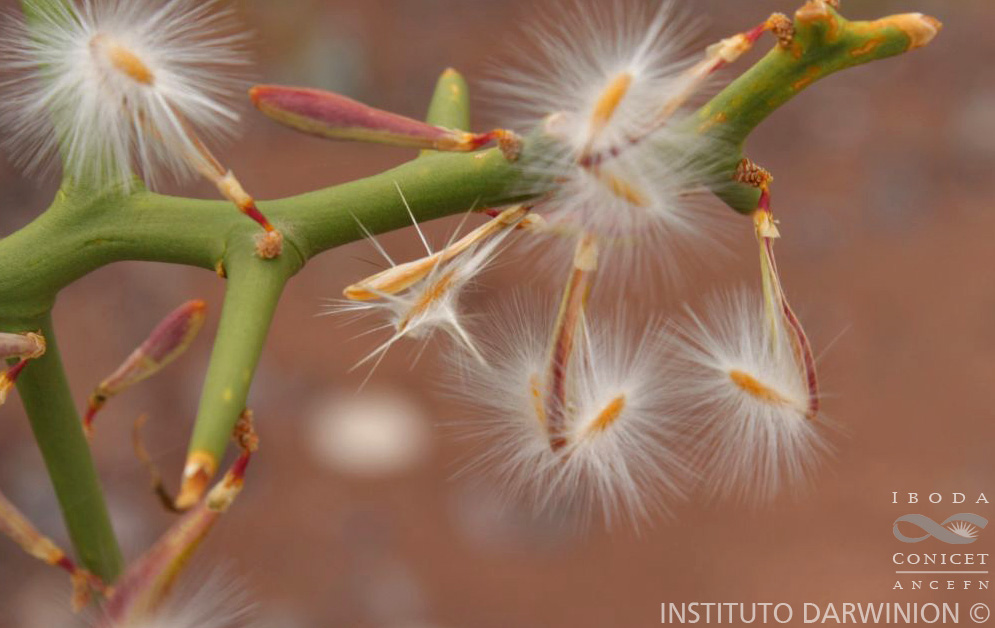 Arbustos de 2-3 m de alto; ramifi cados densamente y de aspecto áfilo, ramas en zig zag, cilíndricas, fotosintéticas, glabras, terminadas en espinas, ramas jóvenes flexibles. Hojas en las ramas jóvenes, sésiles, triangulares, de 1-3 × 1 mm, ápice acuminado, glabras, caducas. Inflorescencias congestas en braquiblastos de 2-4 mm de largo, caducos; brácteas y bractéolas ca. 1 mm de largo, pubérulas, caducas en la antesis. Flores ca. 7 mm de largo; pedicelo ca. 3 mm de largo, pubérulo o glabro; cáliz blanco -verdoso, pubérulos en sus caras o ciliados, persistente en fruto, sépalos externos superiores, libres, ovados, ca. 2 × 1 mm, ápice obtuso, sépalos internos elípticos a ovados, ca. 3 × 2 mm, ápice obtuso; corola blanca, quilla ca. 3,5-4 mm de largo, cuña de 1,5-2 mm de largo, sin cresta; pétalos laterales asimétricos, ca. 4 × 1 mm, ápice agudo u obtuso, con tintes violáceos, pubescentes en la porción media adaxial, fusionados con la vaina estaminal a través de 1/4 de su margen; estambres 8, vaina estaminal ca. 4 mm de largo, glabra, pubescente en sus márgenes, porción libre de los fi lamentos estaminales mayor que el largo de las anteras, ca. 1 mm de largo, anteras poricidas; ovario de contorno oblongo, ca. 1 × 1 mm, simétrico, glabro; estilo ca. 3,5 mm de largo, curvado, no ensanchado distalmente, glabro. Fruto una cápsula obovoide, de 15 × 3 mm, alargada, glabra. Semillas pardas, de 8(-13 mm de largo con los tricomas) × 2 mm, comosas, muy pubescentes; elaiosomas ausentes.