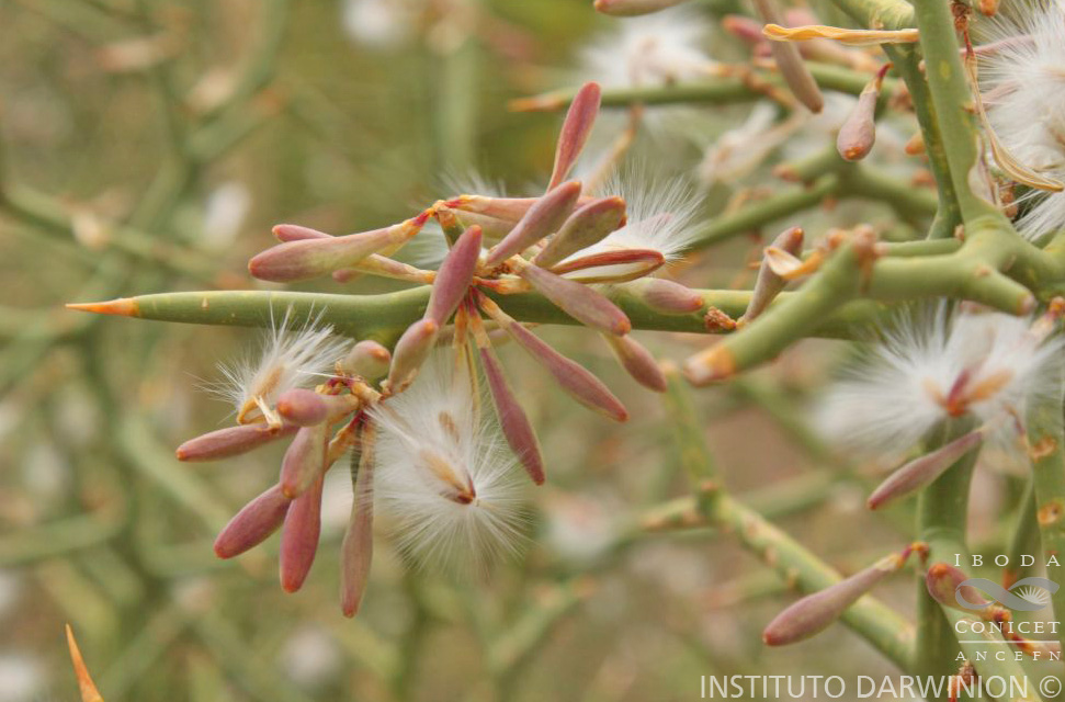 Arbustos de 2-3 m de alto; ramifi cados densamente y de aspecto áfilo, ramas en zig zag, cilíndricas, fotosintéticas, glabras, terminadas en espinas, ramas jóvenes flexibles. Hojas en las ramas jóvenes, sésiles, triangulares, de 1-3 × 1 mm, ápice acuminado, glabras, caducas. Inflorescencias congestas en braquiblastos de 2-4 mm de largo, caducos; brácteas y bractéolas ca. 1 mm de largo, pubérulas, caducas en la antesis. Flores ca. 7 mm de largo; pedicelo ca. 3 mm de largo, pubérulo o glabro; cáliz blanco -verdoso, pubérulos en sus caras o ciliados, persistente en fruto, sépalos externos superiores, libres, ovados, ca. 2 × 1 mm, ápice obtuso, sépalos internos elípticos a ovados, ca. 3 × 2 mm, ápice obtuso; corola blanca, quilla ca. 3,5-4 mm de largo, cuña de 1,5-2 mm de largo, sin cresta; pétalos laterales asimétricos, ca. 4 × 1 mm, ápice agudo u obtuso, con tintes violáceos, pubescentes en la porción media adaxial, fusionados con la vaina estaminal a través de 1/4 de su margen; estambres 8, vaina estaminal ca. 4 mm de largo, glabra, pubescente en sus márgenes, porción libre de los fi lamentos estaminales mayor que el largo de las anteras, ca. 1 mm de largo, anteras poricidas; ovario de contorno oblongo, ca. 1 × 1 mm, simétrico, glabro; estilo ca. 3,5 mm de largo, curvado, no ensanchado distalmente, glabro. Fruto una cápsula obovoide, de 15 × 3 mm, alargada, glabra. Semillas pardas, de 8(-13 mm de largo con los tricomas) × 2 mm, comosas, muy pubescentes; elaiosomas ausentes.