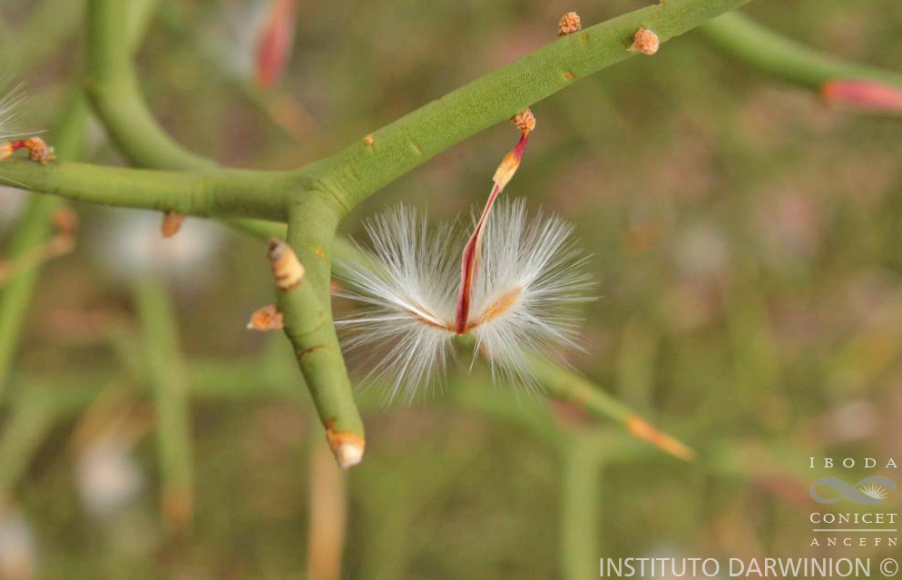 Arbustos de 2-3 m de alto; ramifi cados densamente y de aspecto áfilo, ramas en zig zag, cilíndricas, fotosintéticas, glabras, terminadas en espinas, ramas jóvenes flexibles. Hojas en las ramas jóvenes, sésiles, triangulares, de 1-3 × 1 mm, ápice acuminado, glabras, caducas. Inflorescencias congestas en braquiblastos de 2-4 mm de largo, caducos; brácteas y bractéolas ca. 1 mm de largo, pubérulas, caducas en la antesis. Flores ca. 7 mm de largo; pedicelo ca. 3 mm de largo, pubérulo o glabro; cáliz blanco -verdoso, pubérulos en sus caras o ciliados, persistente en fruto, sépalos externos superiores, libres, ovados, ca. 2 × 1 mm, ápice obtuso, sépalos internos elípticos a ovados, ca. 3 × 2 mm, ápice obtuso; corola blanca, quilla ca. 3,5-4 mm de largo, cuña de 1,5-2 mm de largo, sin cresta; pétalos laterales asimétricos, ca. 4 × 1 mm, ápice agudo u obtuso, con tintes violáceos, pubescentes en la porción media adaxial, fusionados con la vaina estaminal a través de 1/4 de su margen; estambres 8, vaina estaminal ca. 4 mm de largo, glabra, pubescente en sus márgenes, porción libre de los fi lamentos estaminales mayor que el largo de las anteras, ca. 1 mm de largo, anteras poricidas; ovario de contorno oblongo, ca. 1 × 1 mm, simétrico, glabro; estilo ca. 3,5 mm de largo, curvado, no ensanchado distalmente, glabro. Fruto una cápsula obovoide, de 15 × 3 mm, alargada, glabra. Semillas pardas, de 8(-13 mm de largo con los tricomas) × 2 mm, comosas, muy pubescentes; elaiosomas ausentes.