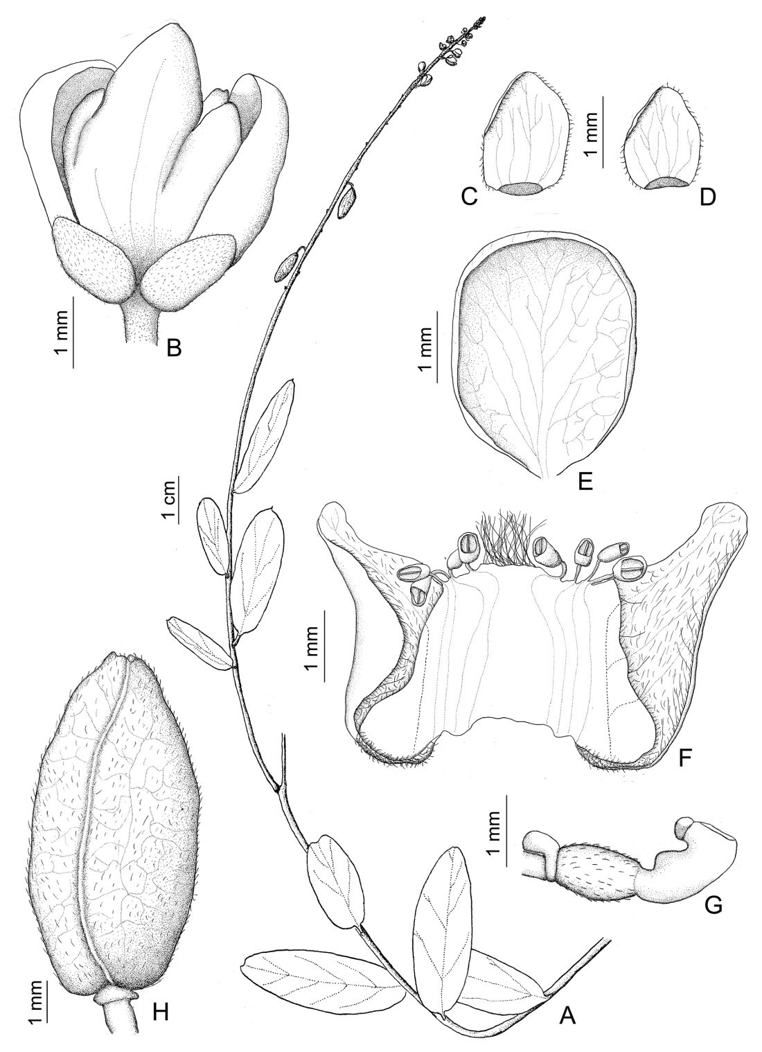 Hierbas de 20-85 cm de alto; tallos glabros o con pubescencia de tricomas estrigosos menores a 0,5 mm de largo; nectarios extrafl orales evidentes a los costados de la inserción de las hojas. Hojas alternas; pecíolos de 1-1,5 mm de largo, pubérulos; láminas lanceoladas a oblongas, de 27-47 × 10-20 mm, ápice agudo a obtuso, mucronado, glabras o glabrescentes. Inflorescencias de 10-15 cm de largo; raquis pubescente, con nectarios extraflorales evidentes a los costados de la inserción del pedicelo; brácteas triangulares, de 2,1-3,2 mm de largo, pubescentes; bractéolas de menor tamaño. Flores ca. 5 mm de largo, rosadas a violáceas y de ápice amarillento; pedicelos ca. 2 mm de largo; sépalos externos pubescentes; sépalo externo inferior elíptico, ca. 1,5 × 1 mm, ápice agudo; sépalos externos superiores ovados, ca. 1 × 1 mm, ápice obtuso a agudo; sépalos internos “alas” orbiculares, ca. 4 × 2,5 mm, ápice obtuso, glabros; quilla 3-lobulada, ca. 4 mm de largo, pétalos laterales ca. 3,5 mm de largo, ápice obtuso, levemente pubescentes o glabros en la porción media adaxial, fusionados con la vaina estaminal; estambres 8, vaina estaminal ca. 3 mm de largo, porción libre de los filamentos estaminales separados entre sí en grupos de cuatro por una barra pubescente; ovario de contorno oblongo, ca. 1,5 × 0,8 mm, pubescente; estilo curvo ca. 2 mm de largo, ensanchado distalmente, auriculado, glabro, área estigmática con el lóbulo estéril agudo, lóbulo fértil 1-tuberculado. Fruto una drupa elipsoide, ca. 7-8 × 3,2-4,5 mm, pubérula. Semilla 1.