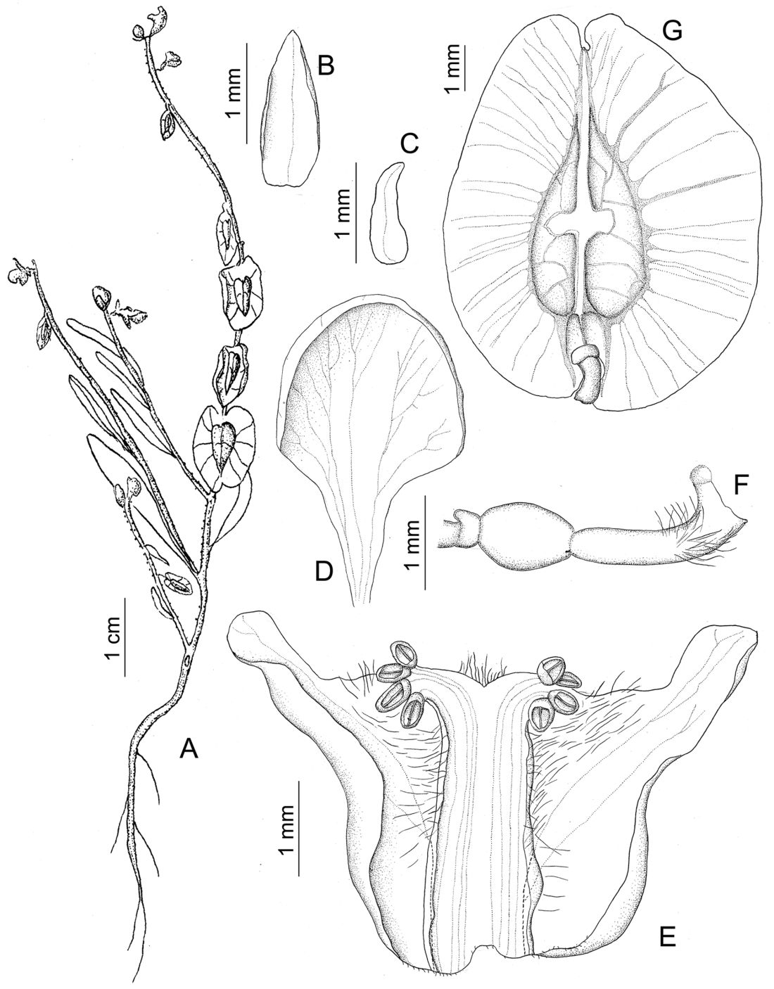 Hierbas de 3-6 cm de alto; tallos con pubescencia de tricomas glandulares menores a 0,5 mm de largo. Hojas alternas; pecíolos de 1-1,3 mm de largo, pubescentes; láminas lineares a oblongas, de 7-15 × 3-5 mm, ápice agudo u obtuso, mucronado o no, pubescentes. Inflorescencias de 1,5-3 cm de largo; raquis pubescente, nectarios extraflorales ausentes; brácteas lanceoladas, de 1-1,5 mm de largo, pubescentes; bractéolas de menor tamaño. Flores ca. 4,5 mm de largo, moradas; pedicelos ca. 0,8 mm de largo; sépalos externos con tricomas escasos; sépalo externo inferior elíptico, ca. 2 × 1 mm, ápice agudo; sépalos externos superiores lanceolados, ca. 1,3 × 0,5 mm, ápice agudo; sépalos internos “alas” orbiculares, ca. 3,5 × 2 mm, ápice obtuso, glabros o con escasos tricomas; quilla 3-lobulada ca. 3,8 mm de largo, pétalos laterales ca. 4 mm de largo, ápice obtuso, pubescentes en la porción media adaxial, fusionados con la vaina estaminal; estambres 8, vaina estaminal ca. 2,7 mm de largo, porción libre de los filamentos estaminales separados entre sí en grupos de cuatro por una barra 2-furcada que puede ser glabra o pubescente; ovario de contorno oblongo, ca. 1,5 × 1 mm, glabro; estilo curvo ca. 1,5 mm de largo, levemente ensanchado distalmente, no auriculado, pubescente, área estigmática con el lóbulo estéril agudo, lóbulo fértil 2-tuberculado. Fruto samaroide cordiforme, de 7-8 × 6-7 mm, simétrico, glabro. Semillas 2.